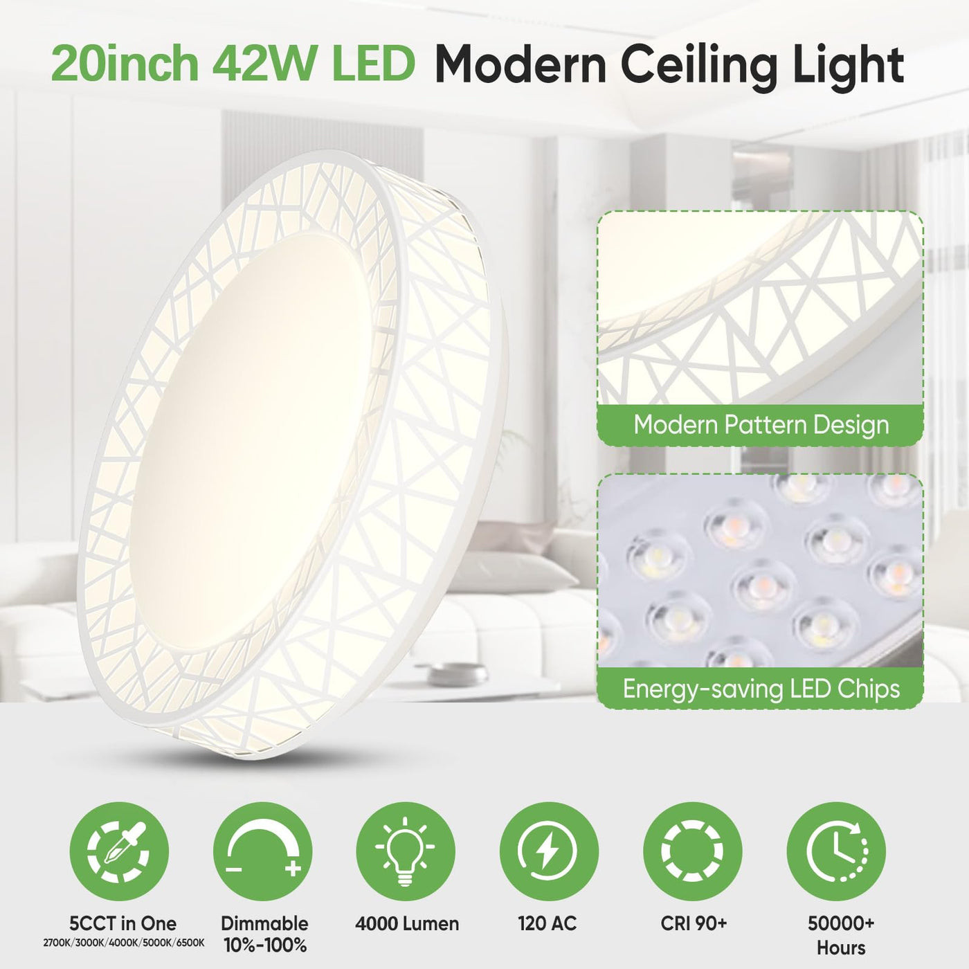 Lightania 20 Inch Flush Mount Ceiling Light, Modern White Led Ceiling Light Fixture, 42W 4000Lm 2700-6500K Adjustable, Dimmable