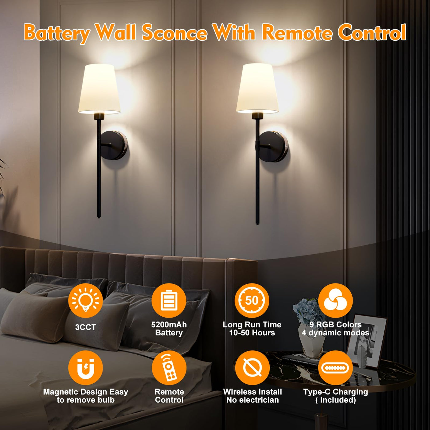 Lightania Battery Operated Wall Sconce Set Of 2, Black Rechargeable Wall Lights With 5200Mah Dimmable Bulbs And Remote, 12 Color
