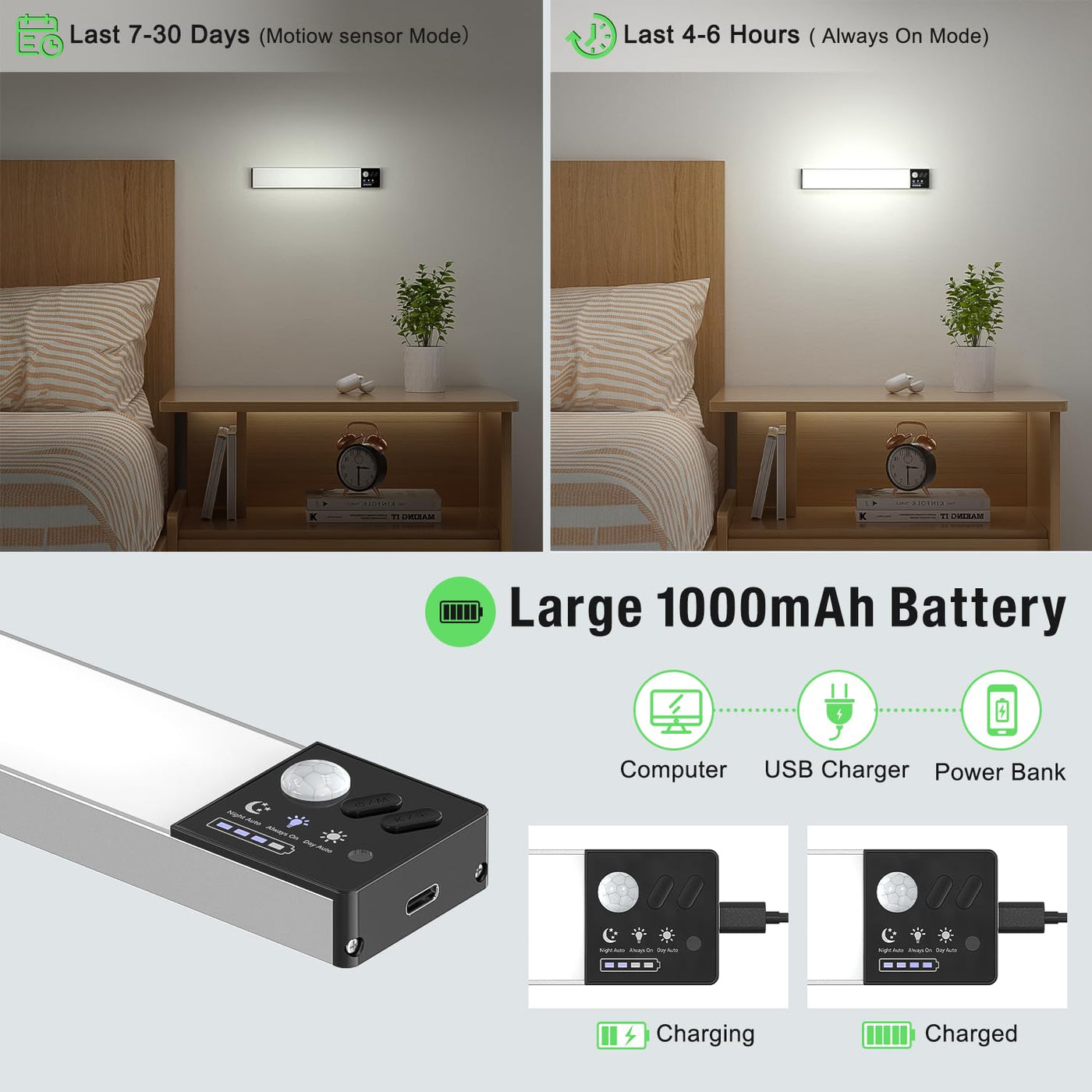 Lightbiz Dimmer 56-Led Light With Unique Charging Station.&Nbsp;It Can Charge 3 Lights At Once, Super Saves Space And Very Convenient For Storage.How To Use It (Pressing The Button)? Night Mode: Single Press The Button M, Night Auto Mode Indicator Lights Up. In This Mode, It Will Turn On When Detects Movement In Dark Enough Condition.&Nbsp;? Day Mode: Single Press The Button M, Day Auto Mode Indicator Lights Up. In This Mode, It Will Light Up When It Detects Movement Not Only In Dark Condition But Also In Daytime.? Always-On Mode: Single Press The Button M, Always On Indicator Lights Up. In This Mode, The Light Will Always On.? On/Off: Long Press The Switch For 3-5 Seconds.Specification:Material: Aluminum+Absled Qty:56Ledssensing Range: 120, 3M/10Ftpower: 2Wbattery: 1500Mahlumens: 50-200Lmoperating Temperature: 0-80Charging Description:Charging:&Nbsp;The Blue Indicator Light Is Dynamiccharged: The Blue Indicator Light Is Always Oncharging Time: About 2-3 Hrspackage Included:3 X 56-Leds Motion Sensor Light6 X Adhesive Metal Plates1 X Usb-C Cable1 X Charging Station1 X Manual