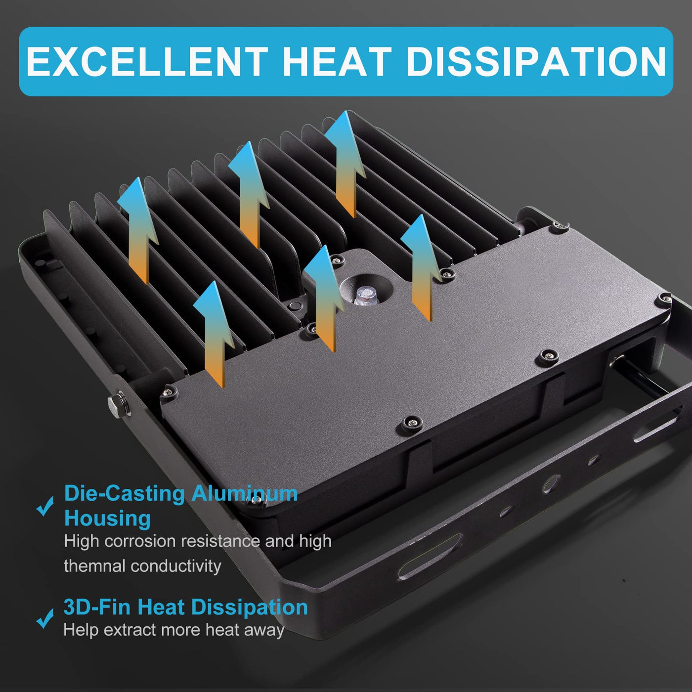 - **Rugged and Weatherproof**: Constructed from die-cast aluminum with an IP65 waterproof rating, this flood light is designed to withstand the elements. Its fully enclosed structure and superior heat dissipation ensure a lifespan of over 50,000 hours, making it perfect for outdoor security lighting in any environment.