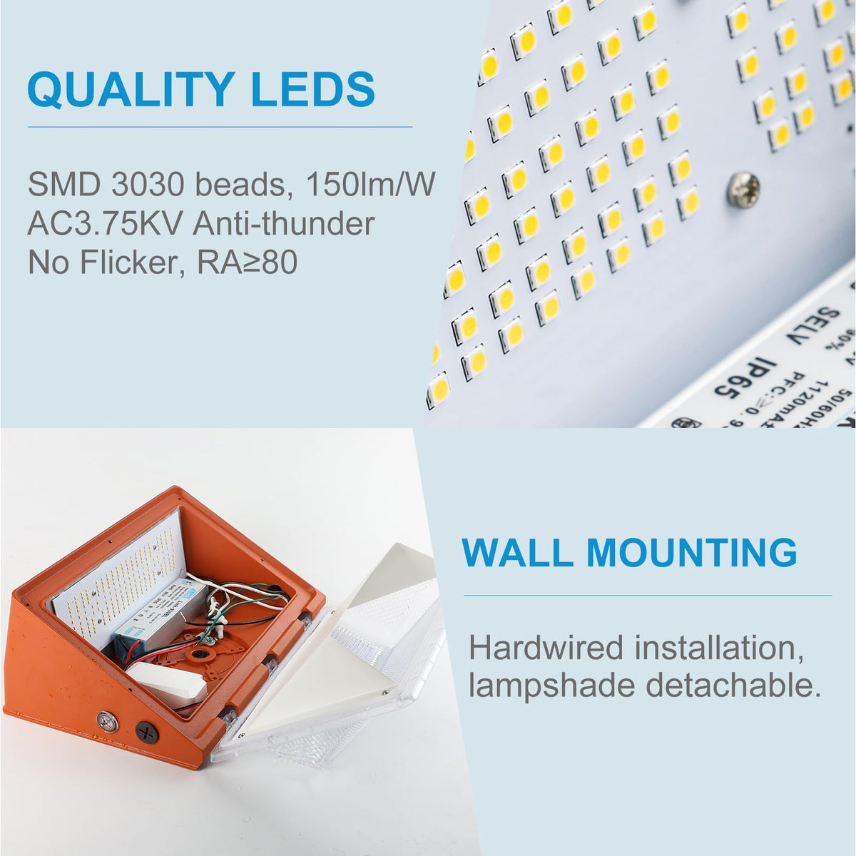 - **Efficient and Bright**: Each 200W LED Wall Pack Light delivers an impressive 30,000 lumens of 5000K daylight, significantly reducing energy costs with a consumption savings of up to 3000KW*2/Y (based on 5 hours of usage per day). Designed for longevity, these lights have an impressive lifespan of over 50,000 hours.