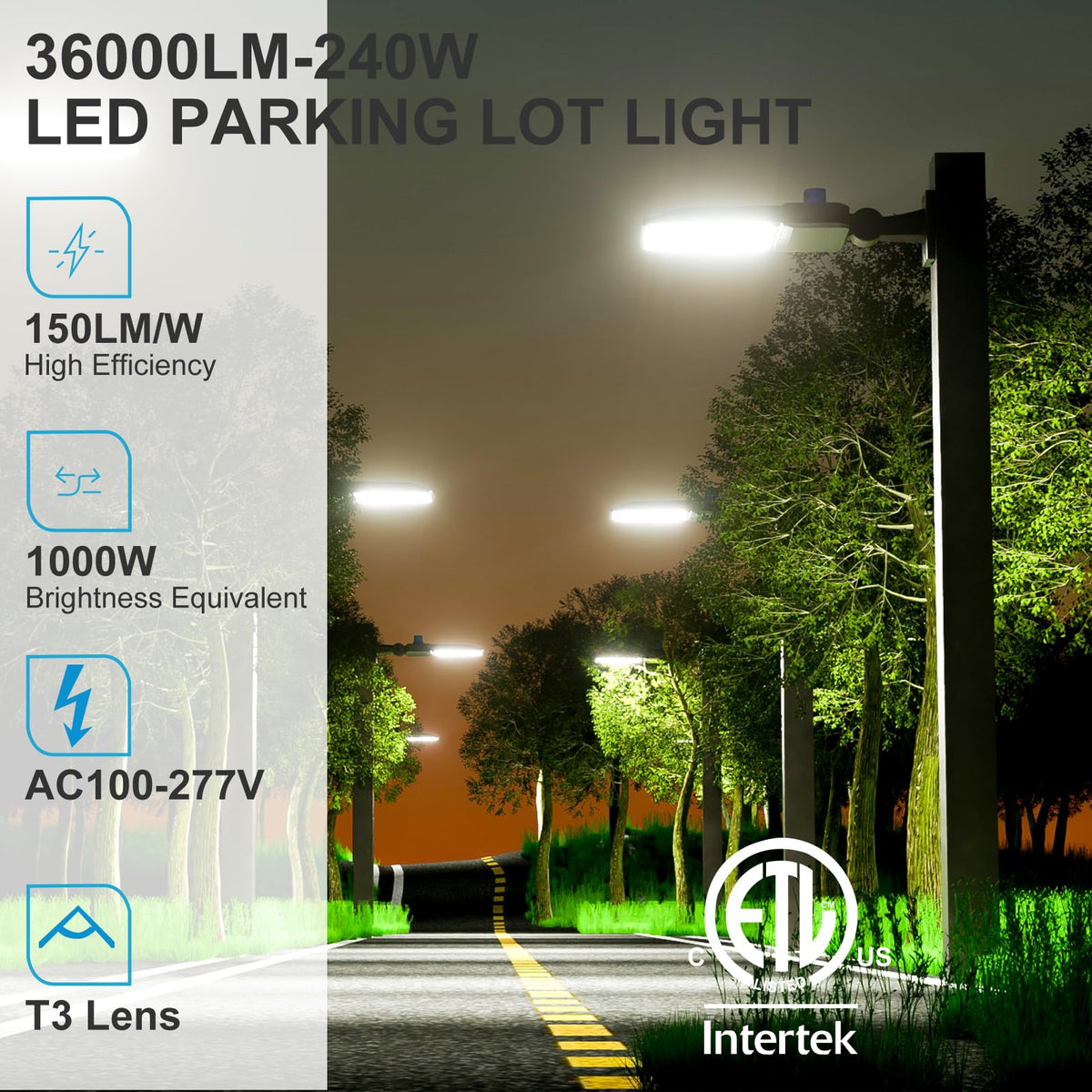 - **High Brightness & Exceptional Design**: With a T3 lens design, this parking lot light delivers an impressive brightness output of 36,000 lumens at 5000K, achieving an efficiency of 150 lumens per watt. Perfect for enhancing visibility and safety in outdoor areas.