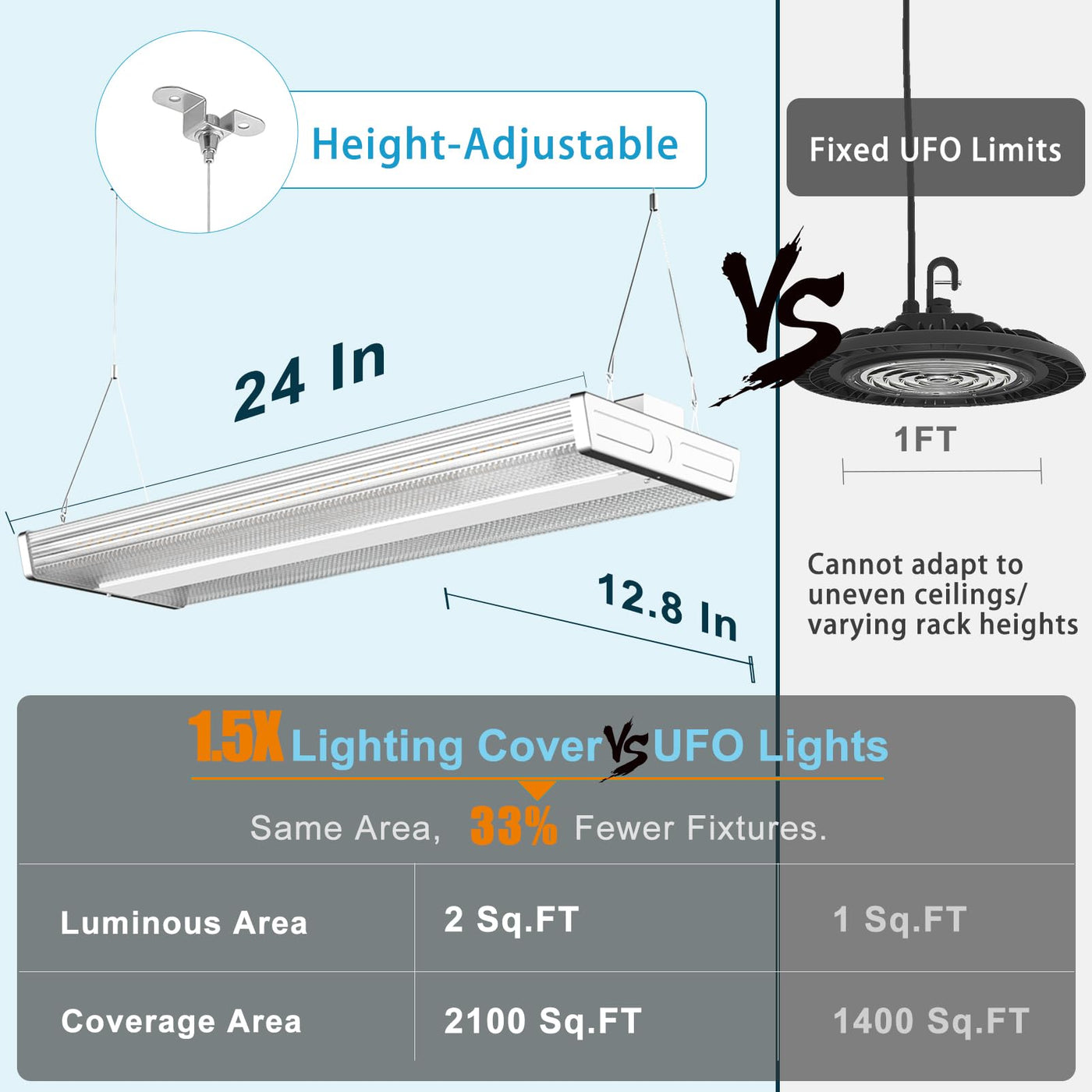 Q: Are these LED high bay lights suitable for outdoor use?A: While the Lightdot 2FT LED High Bay Shop Lights are designed for commercial and industrial spaces such as warehouses, garages, and workshops, they are not specifically rated for outdoor use. It's recommended to use them in enclosed or indoor environments to ensure optimal performance and longevity.