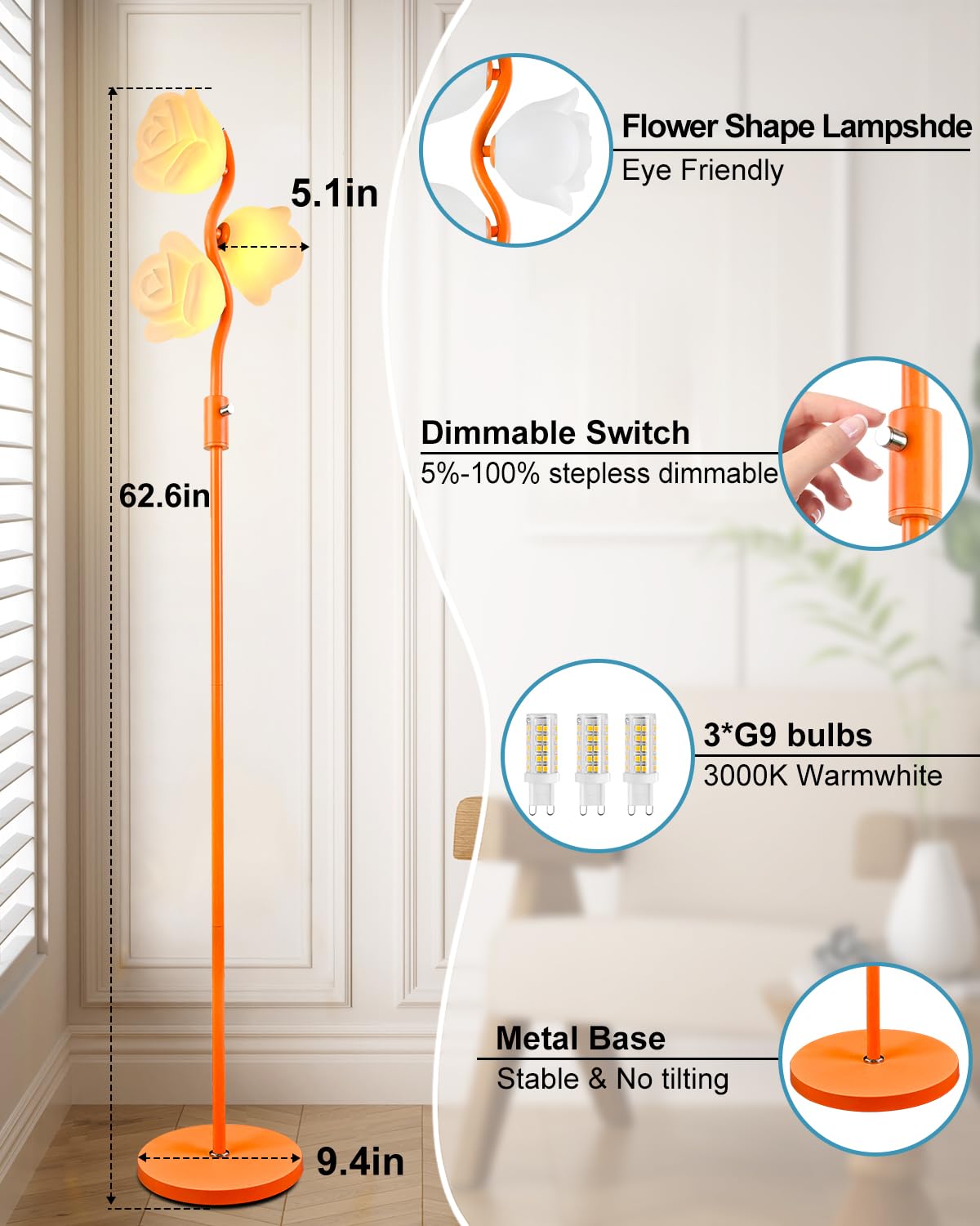 3-Light Flower Floor Lamp, Dimmable Modern Mid Century Orange Standing Lamp With S Pole & G9 Bulbs, 3000K Warmwhite Unique Cute Floral Tall Lamp For Living Room Bedroom Home Office