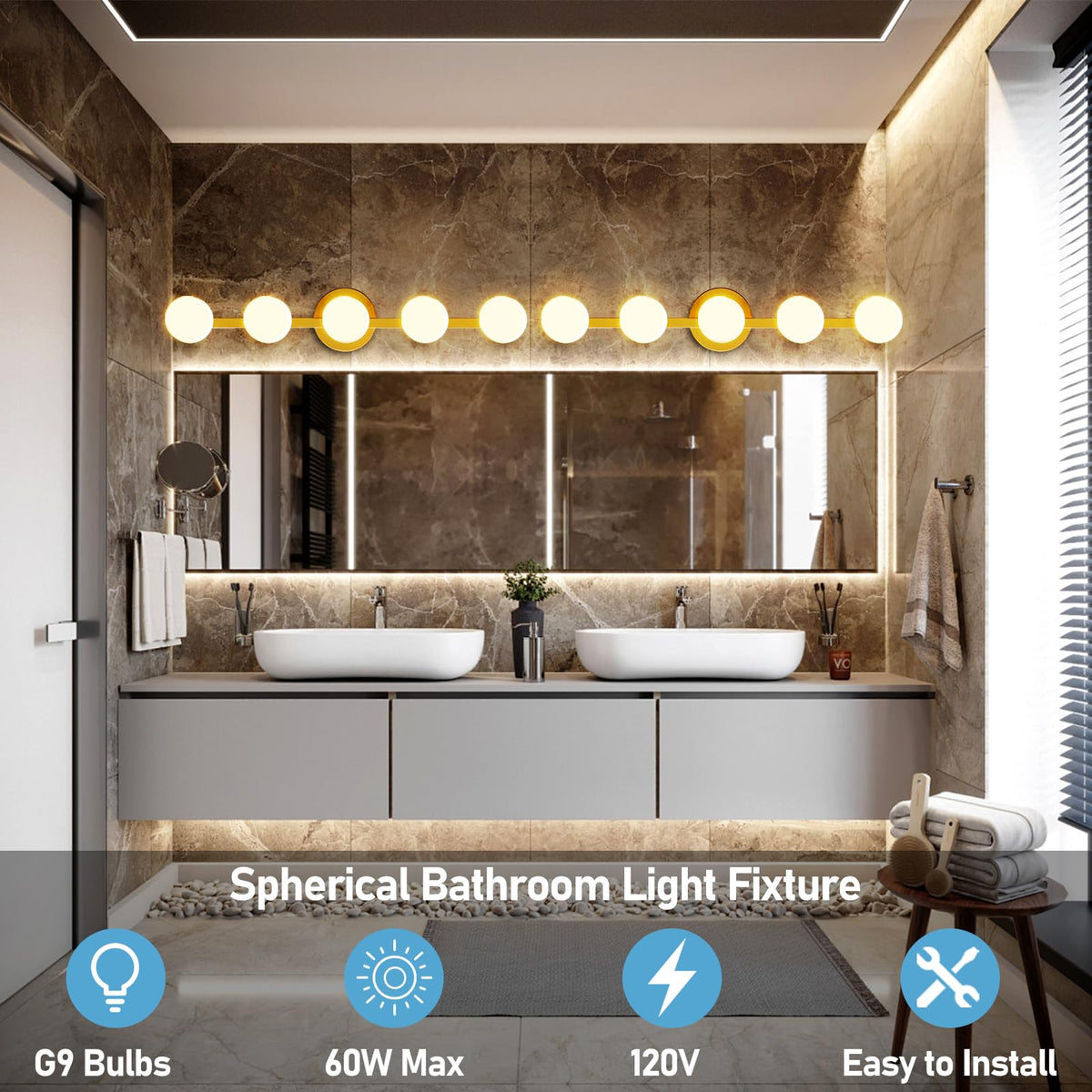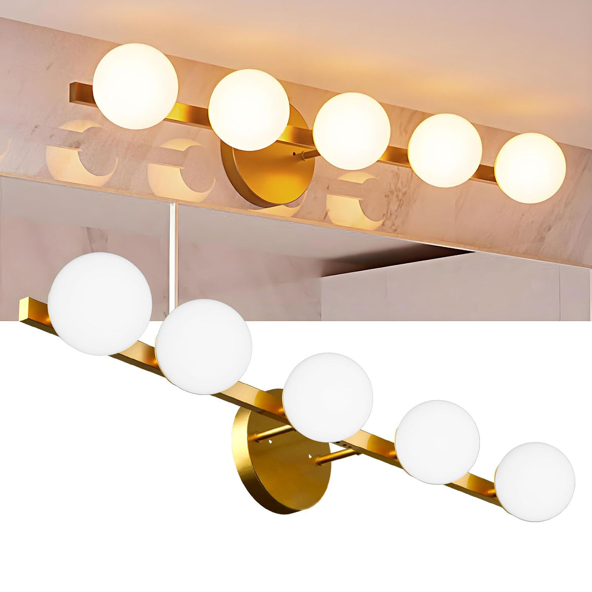 Lightdot 31'' 5-Light Modern Bathroom Vanity Light | Matte Gold Straight Frame With White Globe Water/Shatterproof Shades | Dimm