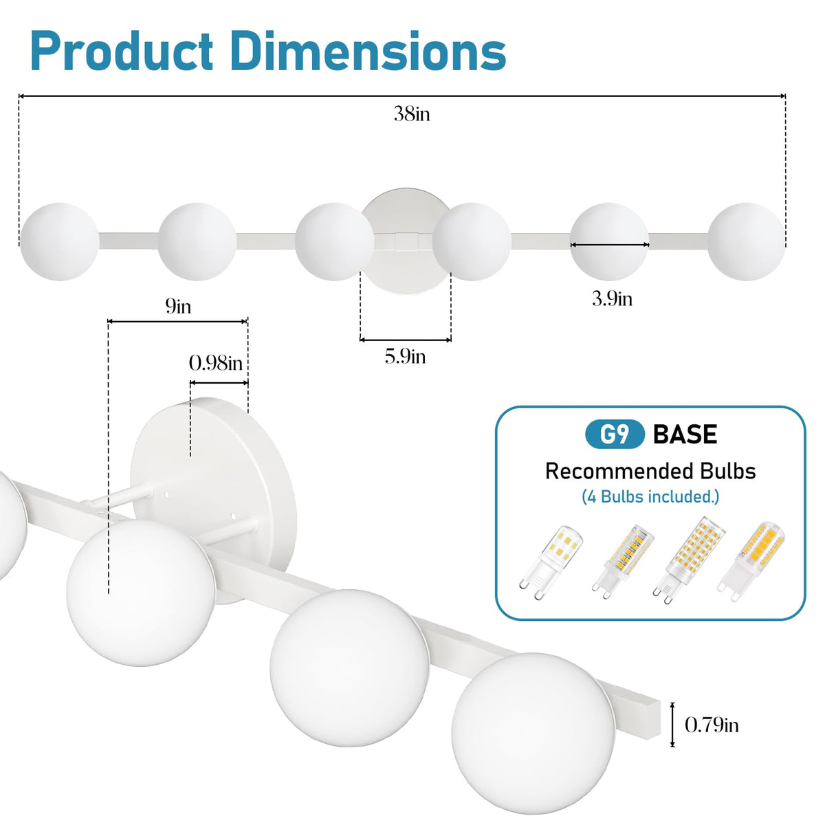 Lightdot 38'' 6-Light Modern Bathroom Vanity Light | Matte Gold Straight Frame With White Globe Water/Shatterproof Shades | Dimm