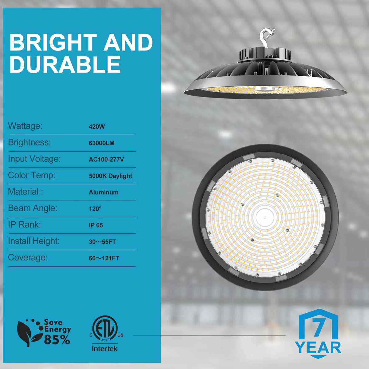 Energy Efficient: This high bay light consumes only 420W while delivering powerful lighting, making it highly energy-efficient. It’s designed to provide significant energy savings compared to traditional lighting options without compromising on performance.