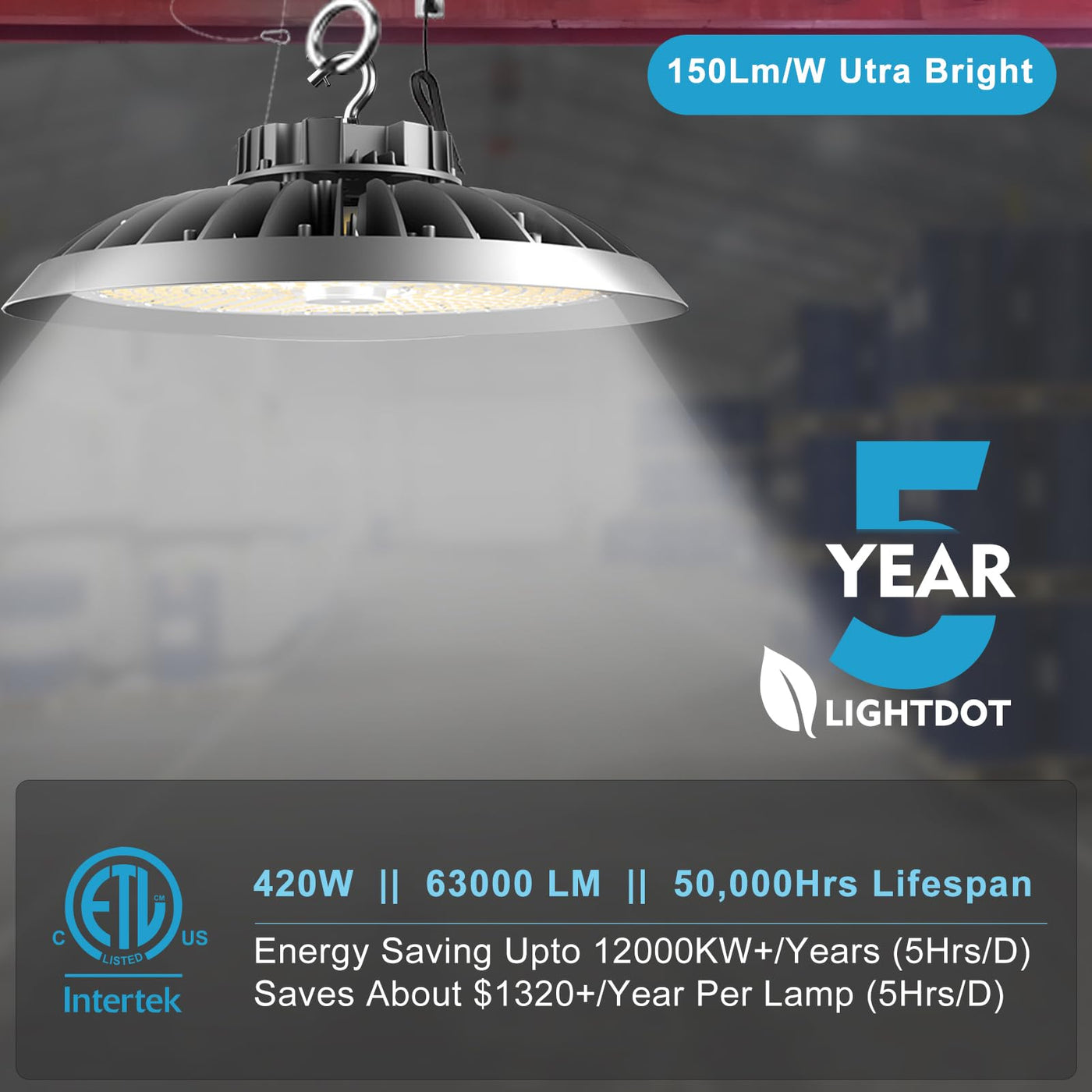Unmatched Brightness: With a 60,000-lumen output, the Lightdot 420W LED High Bay Light provides incredibly bright illumination, ensuring maximum visibility in large areas. Whether you’re lighting up a warehouse, factory floor, or distribution center, this light guarantees clear and effective lighting for workspaces.