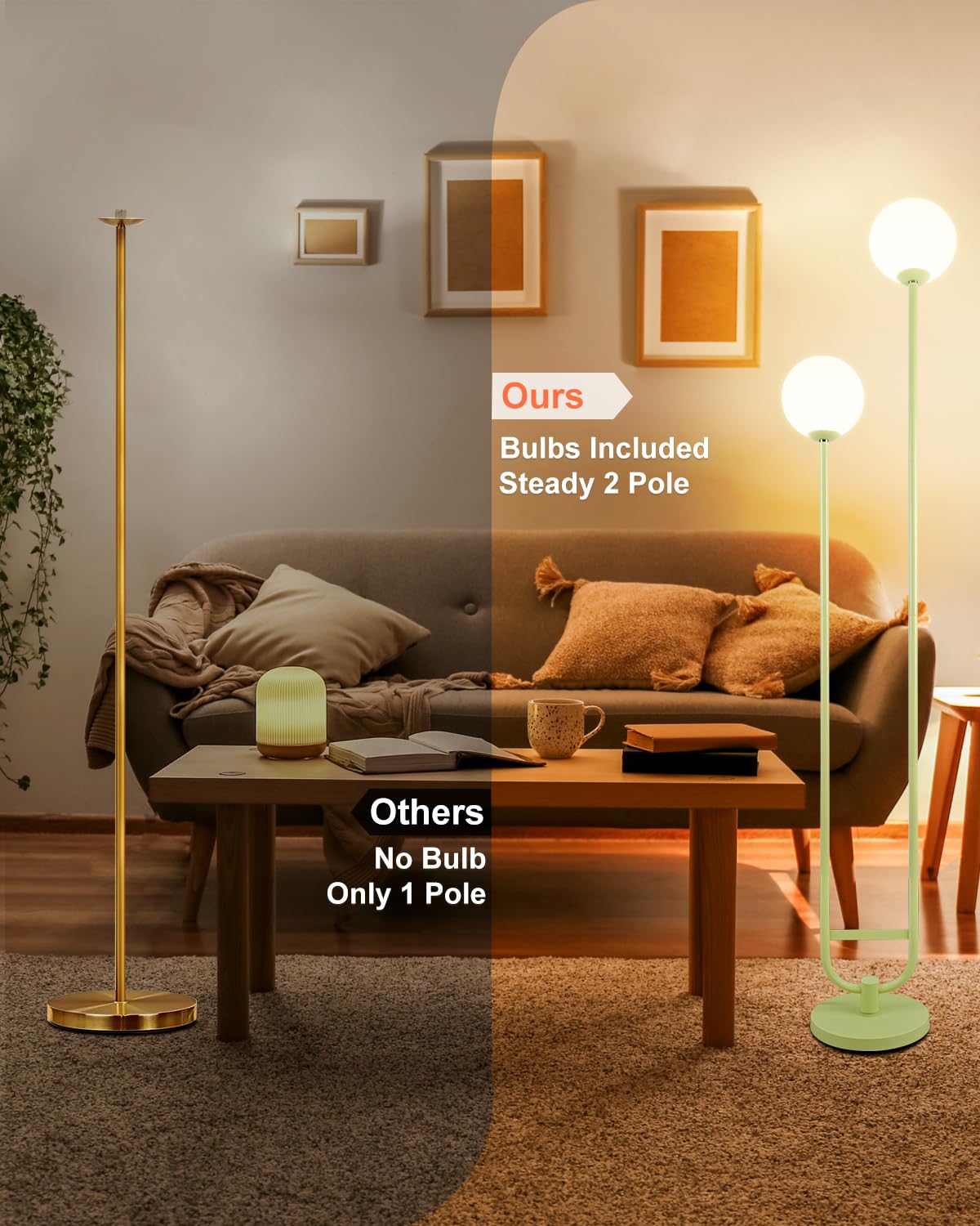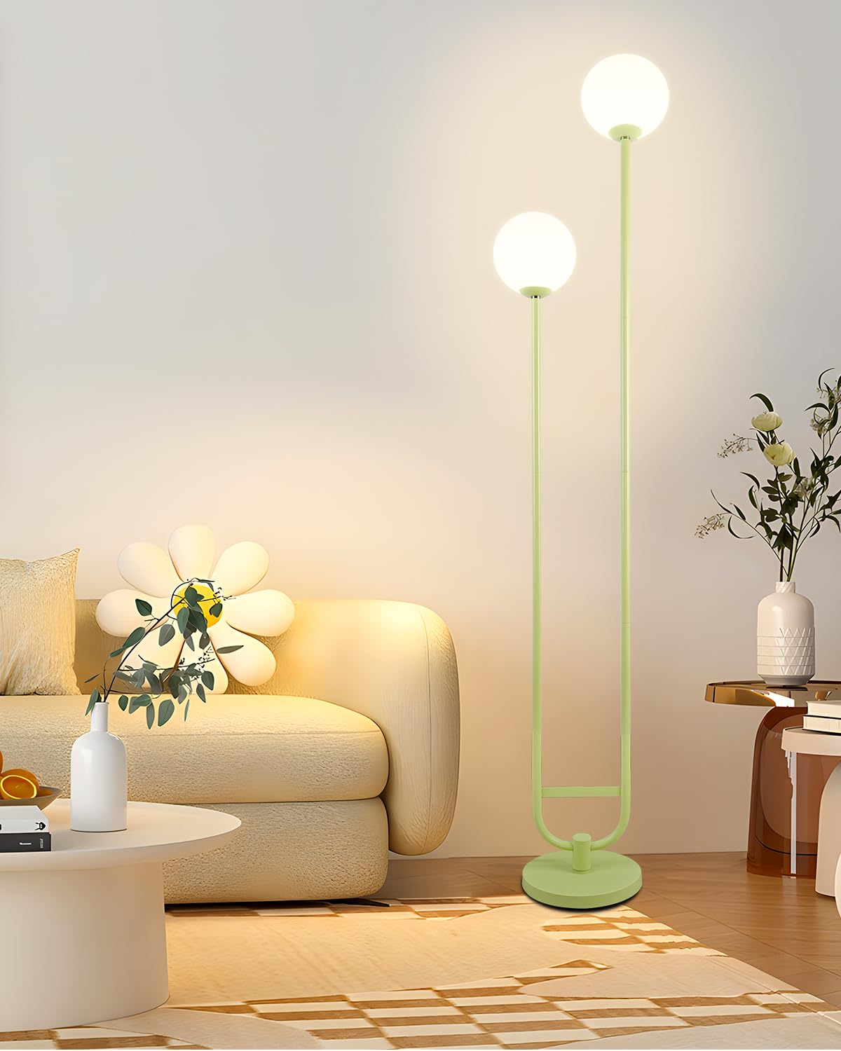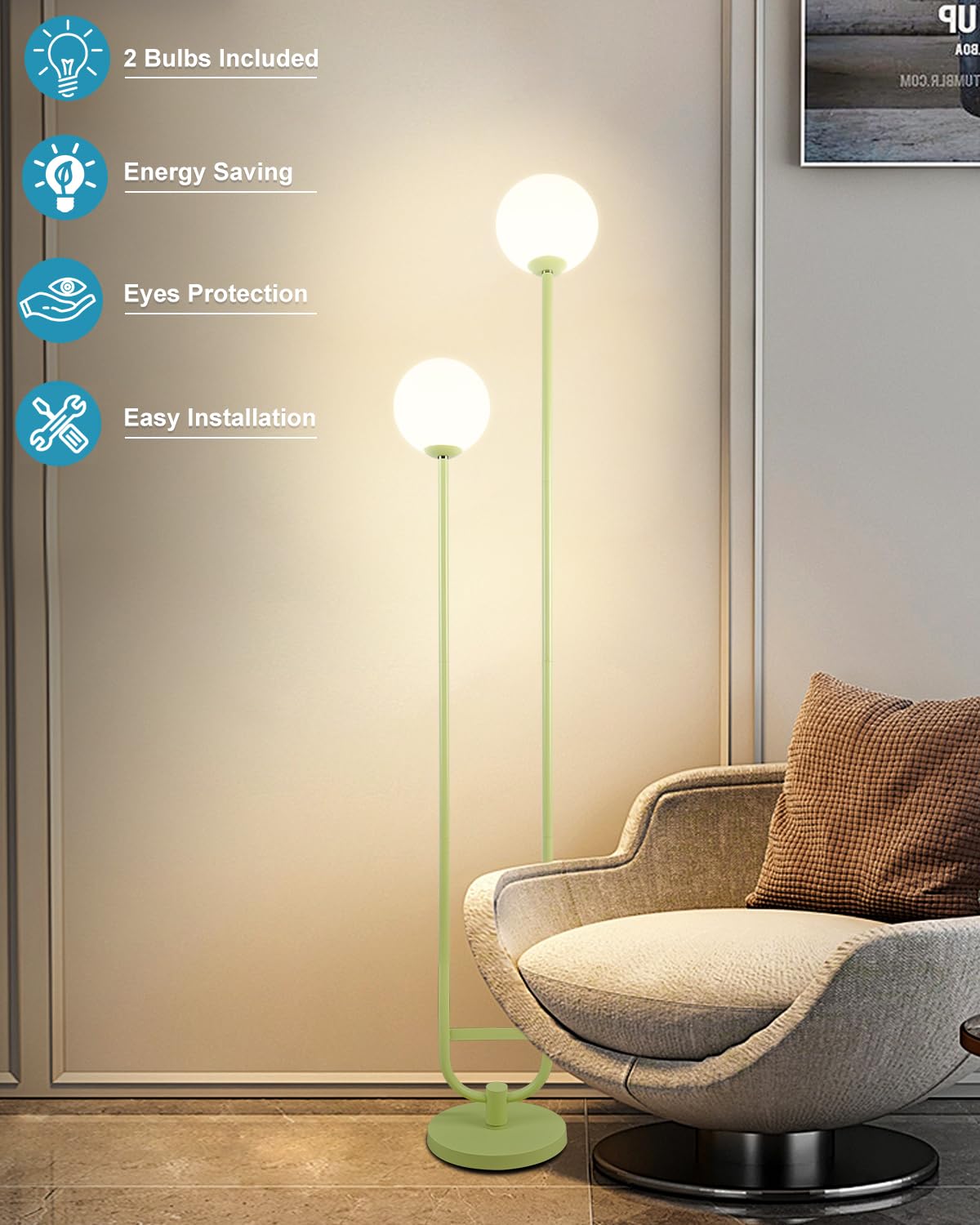 Lightdot 63In Globe Floor Lamp With Green U Pole, Modern Mid Century Standing Lamps With 2 Globe Warm White 3000K Bulbs Included