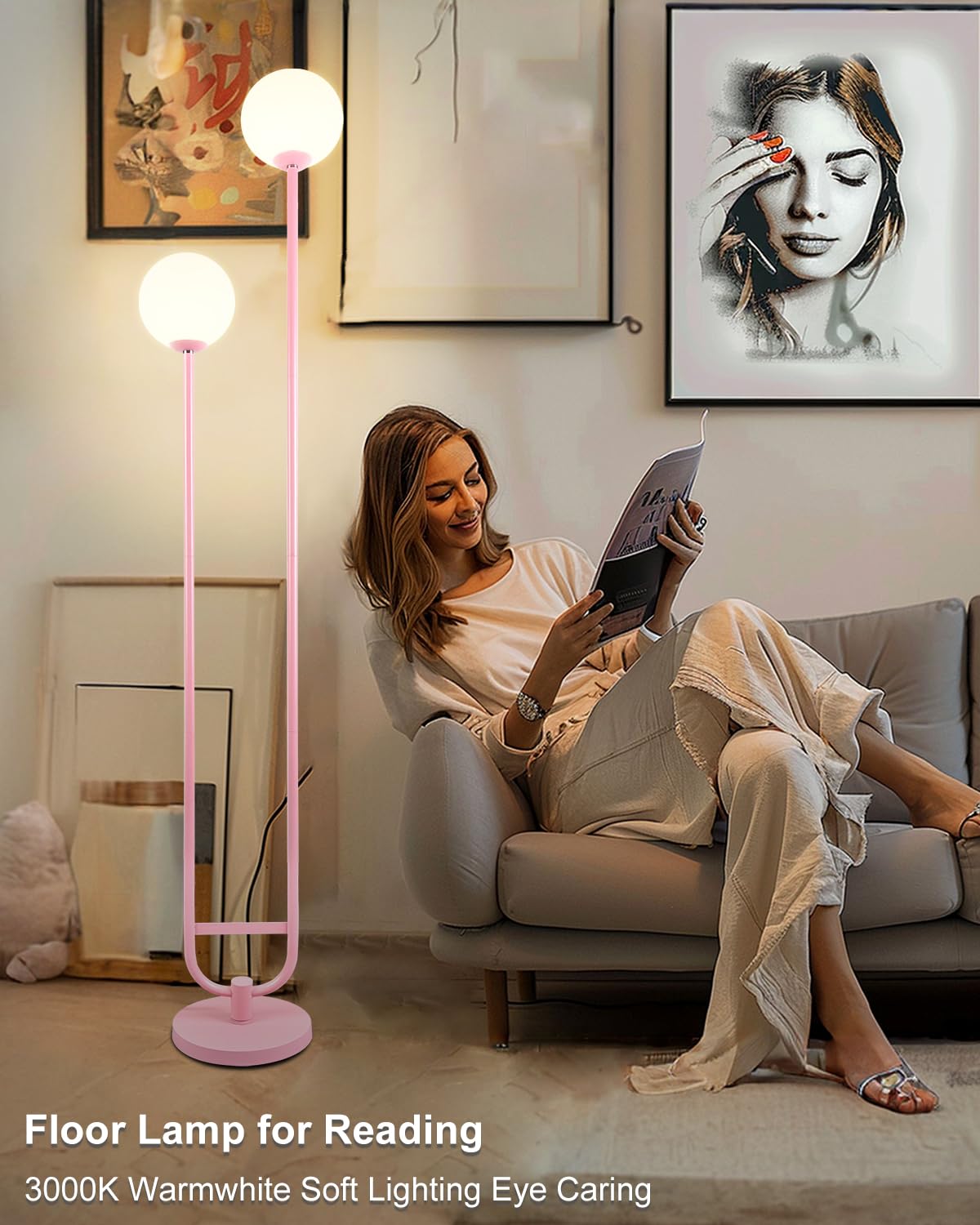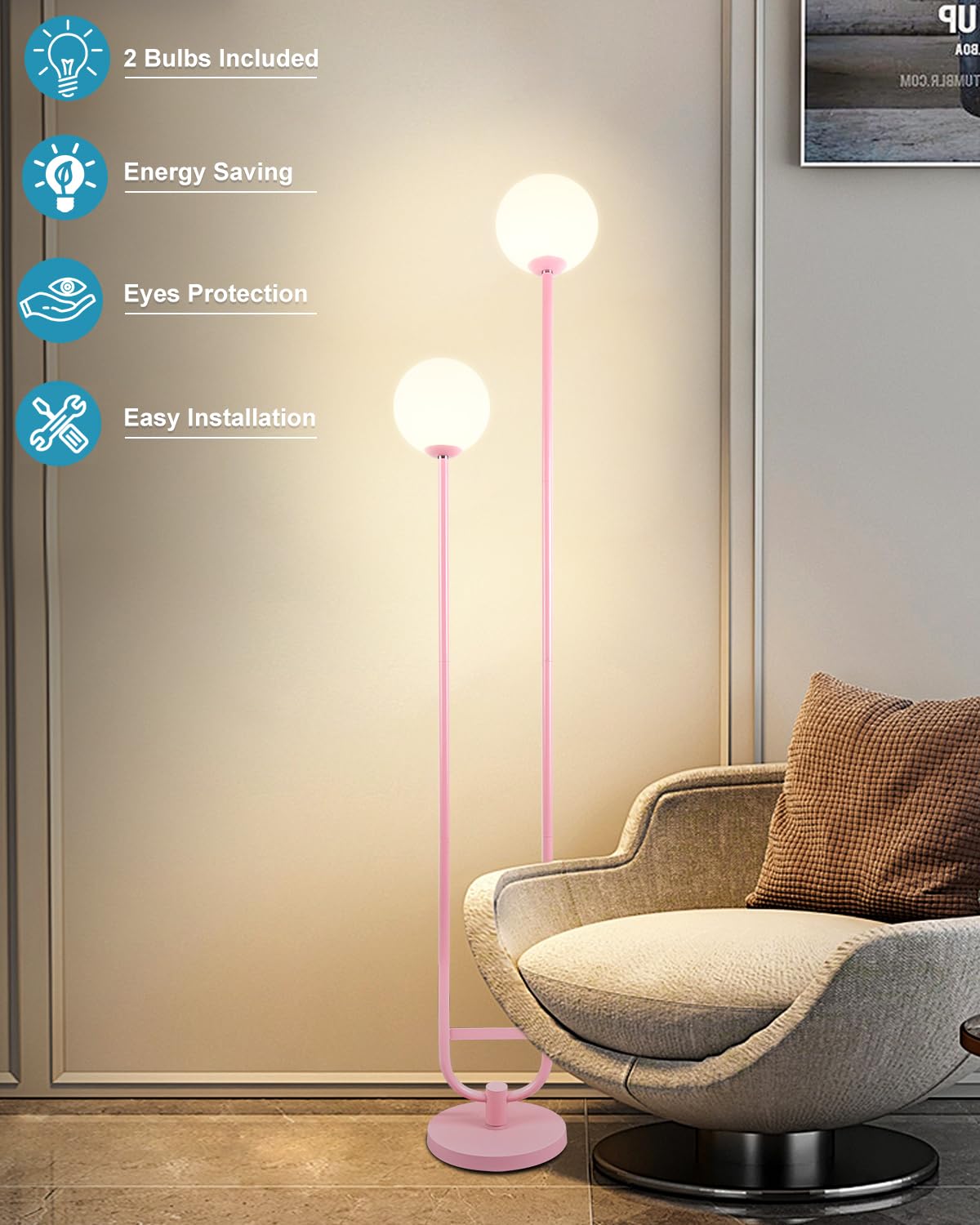 Q: What makes the design of the Lightdot floor lamp unique?A: The Lightdot 63IN Gold Floor Lamp features a unique and exquisite design with two globe lights scattered on a U-shaped metal pole. Its elegant and minimalist structure allows it to match various home decor styles while adding a vintage touch.
