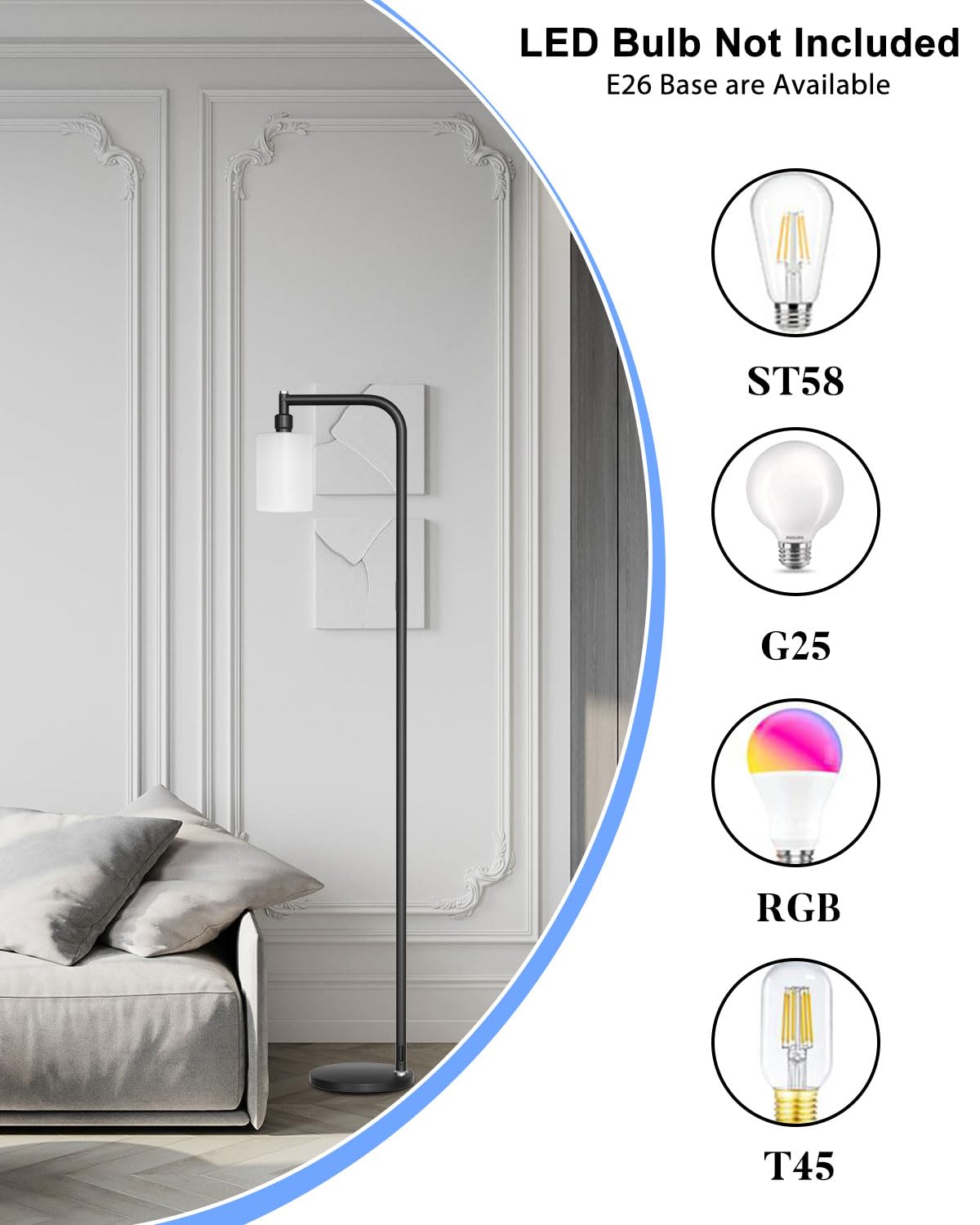 Lightdot 63In Industrial Floor Lamp, Black Modern Standing Lamps With Frosted Glass Lampshade, Farmhouse Floor Lamp For Living R