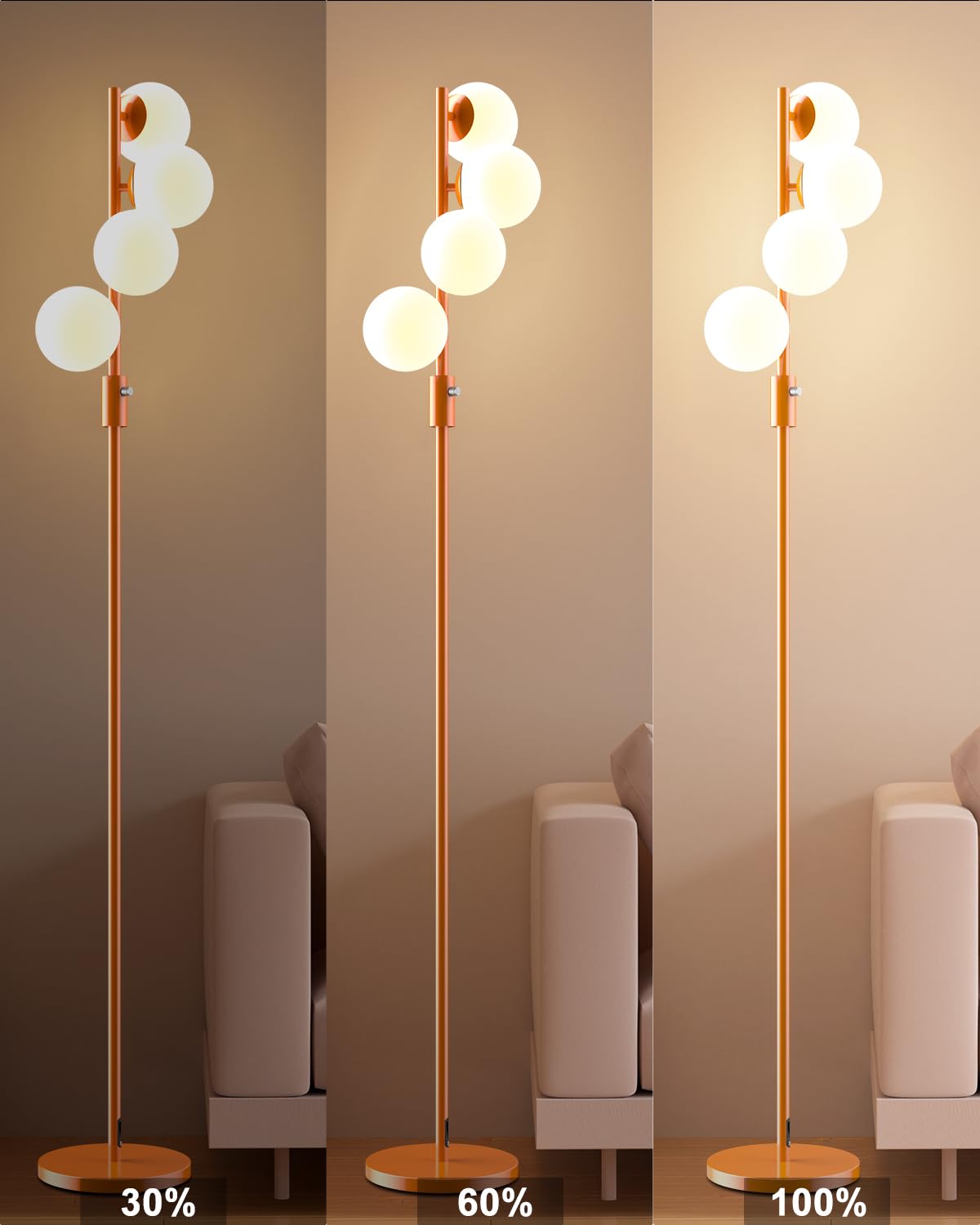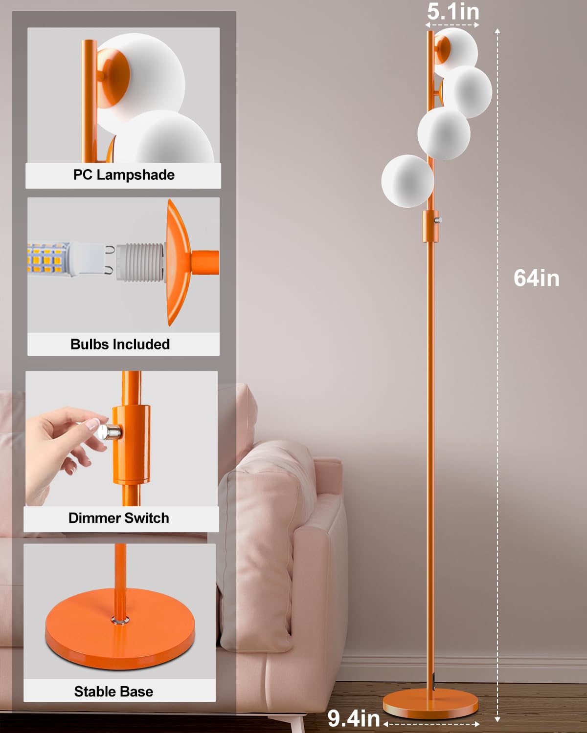 Lightdot 64In Dimmable (Brightness Adjustable) Globe Floor Lamp, Orange Pole Standing Lamps With 4Pcs 3000K G9 Bulbs Soft Warm W