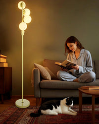 Q: What style does the Lightdot Globe Floor Lamp complement?A: The mid-century modern design of the Lightdot Globe Floor Lamp features a combination of white frosted PC lampshades and a retro black pole, making it a perfect match for various home decor styles, adding a vintage and artistic touch to any space.