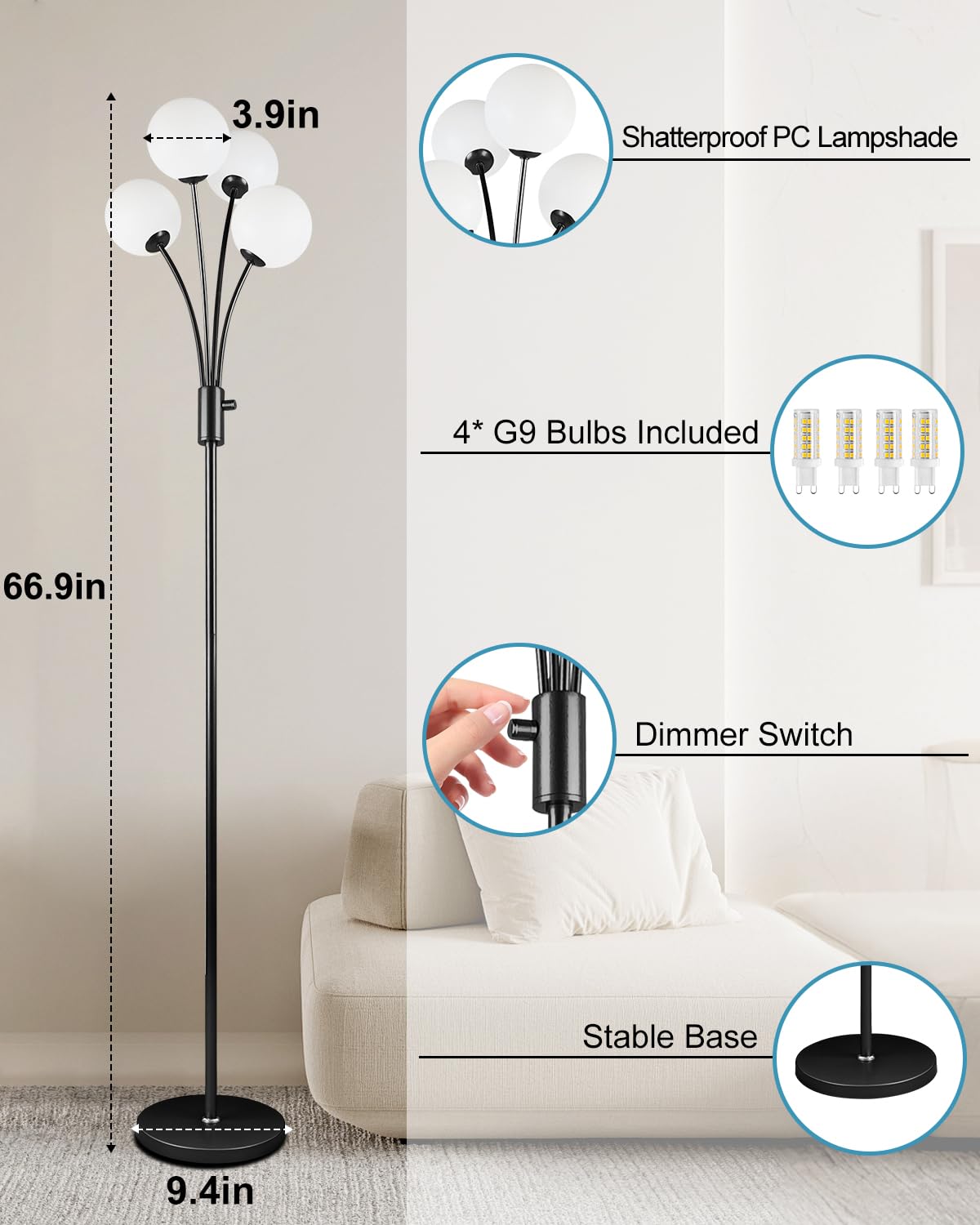 Lightdot 67In Dimmable Globe Floor Lamp 4-Lights Black Standing Lamps With 4Pcs 3000K G9 Bulbs Soft Warm White Mid Century Moder
