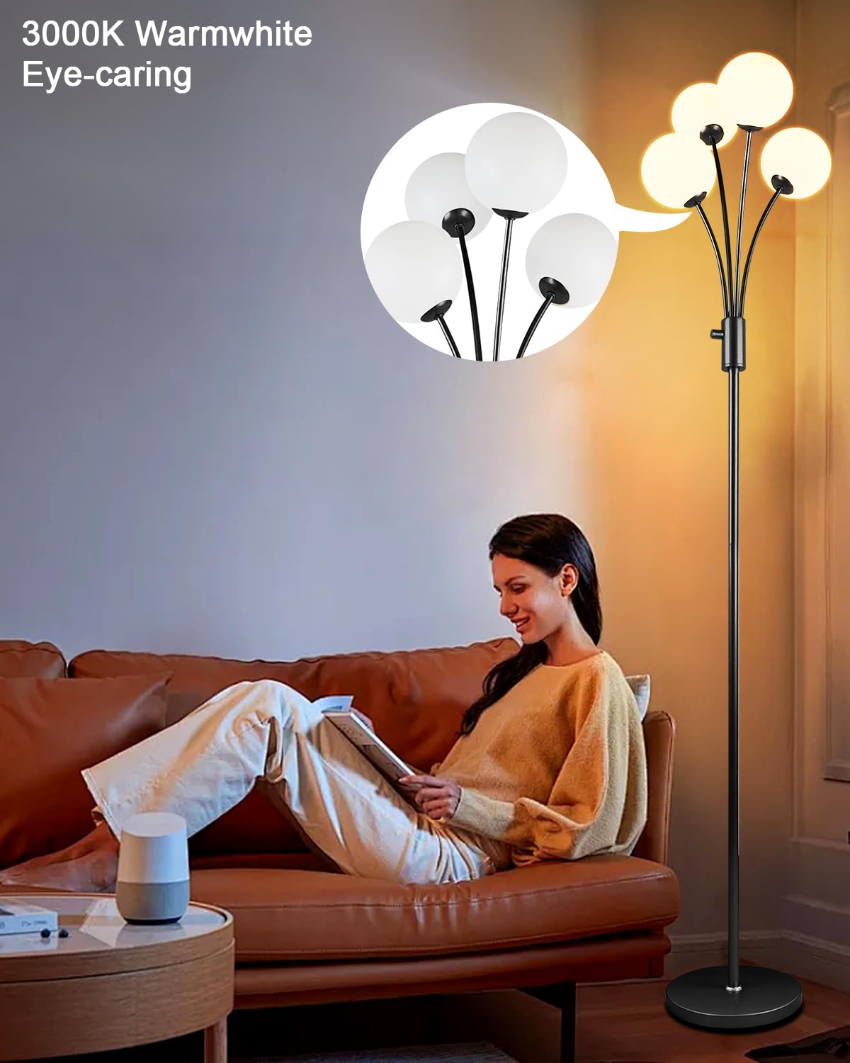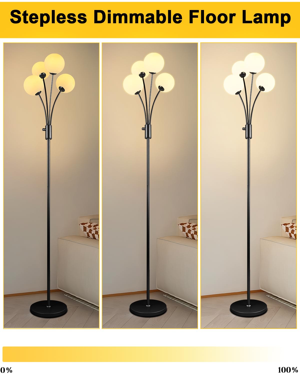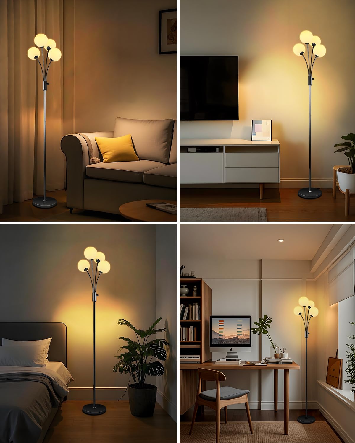 4-globe gold floor lamp with an eye catching design which easy fits with many home decors such as mid century, modern, contemporary, retro, rustic, boho, farmhouse etc. The entire light fixture is equipped with metal and weighted lamp base, make it safety when pets and kids play around.