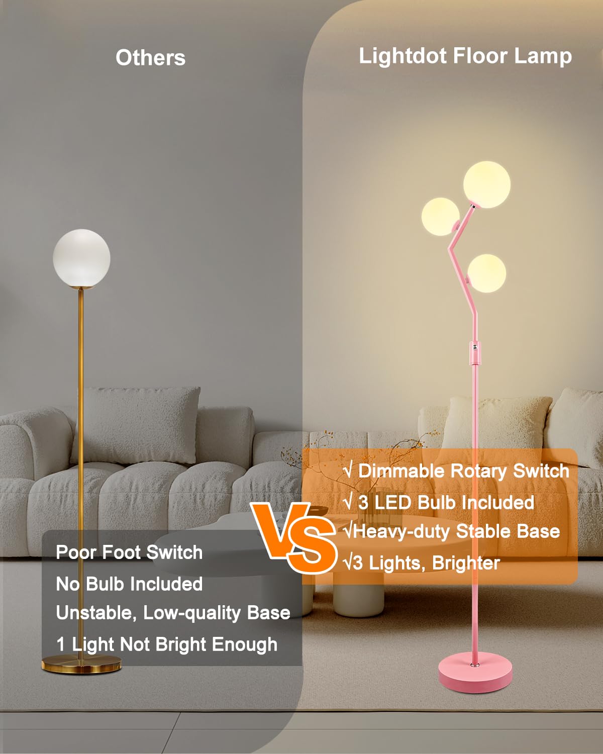Q: How tall is the Lightdot floor lamp, and is it stable?A: The Lightdot Geometric Folding 3 Globe Tree Floor Lamp stands at 65 inches tall. It is designed with a weighted base to ensure stability and prevent tipping, making it safe for use around children, pets, and the elderly.