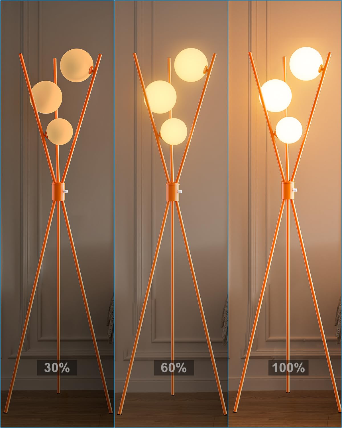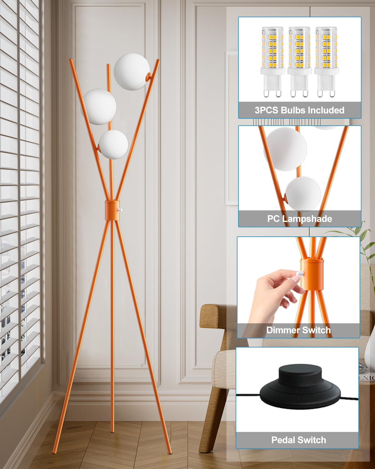 Lightdot Globe Standing Lamps Stepless Dimmable Tripod Floor Lamp With 3Pcs 3000K G9 Bulbs Stable Base Orange Mid Century Modern