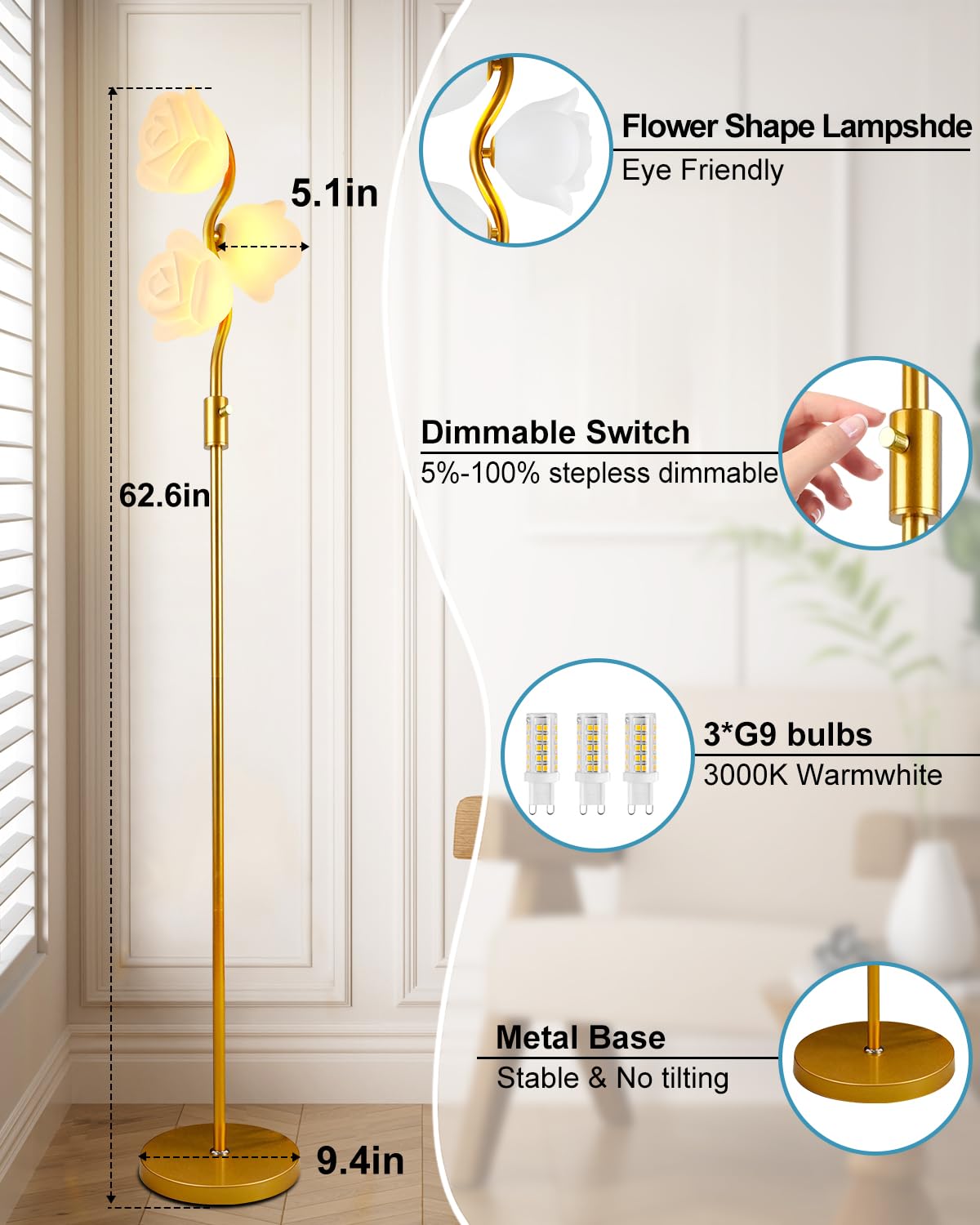 Lightdot Gold Flower Floor Lamp Stepless Dimmable Modern Mid Century Standing Lamp Floral 3-Light Floor Lamps With 3000K G9 Bulb