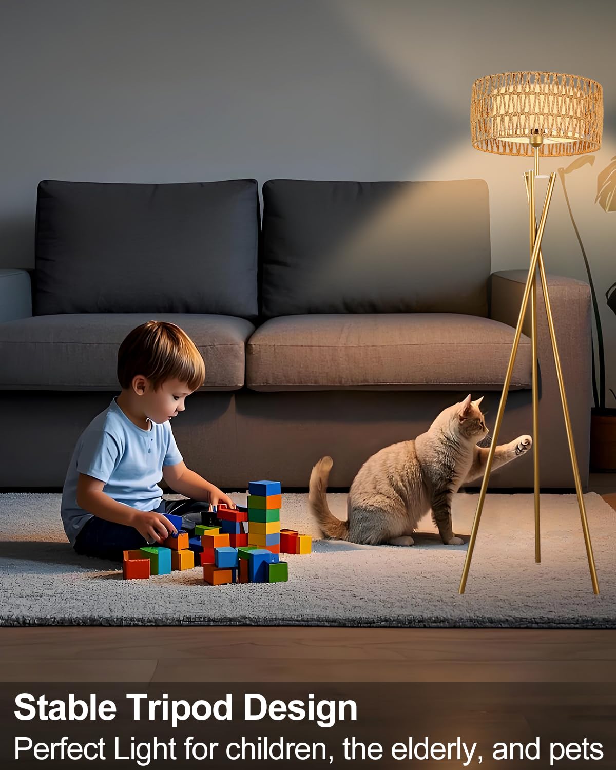 Lightdot Rattan Floor Lamp - Mid Century, Modern Design For Living Room, Bedroom & Office - 3000K Soft Light, Gold E26 Base
