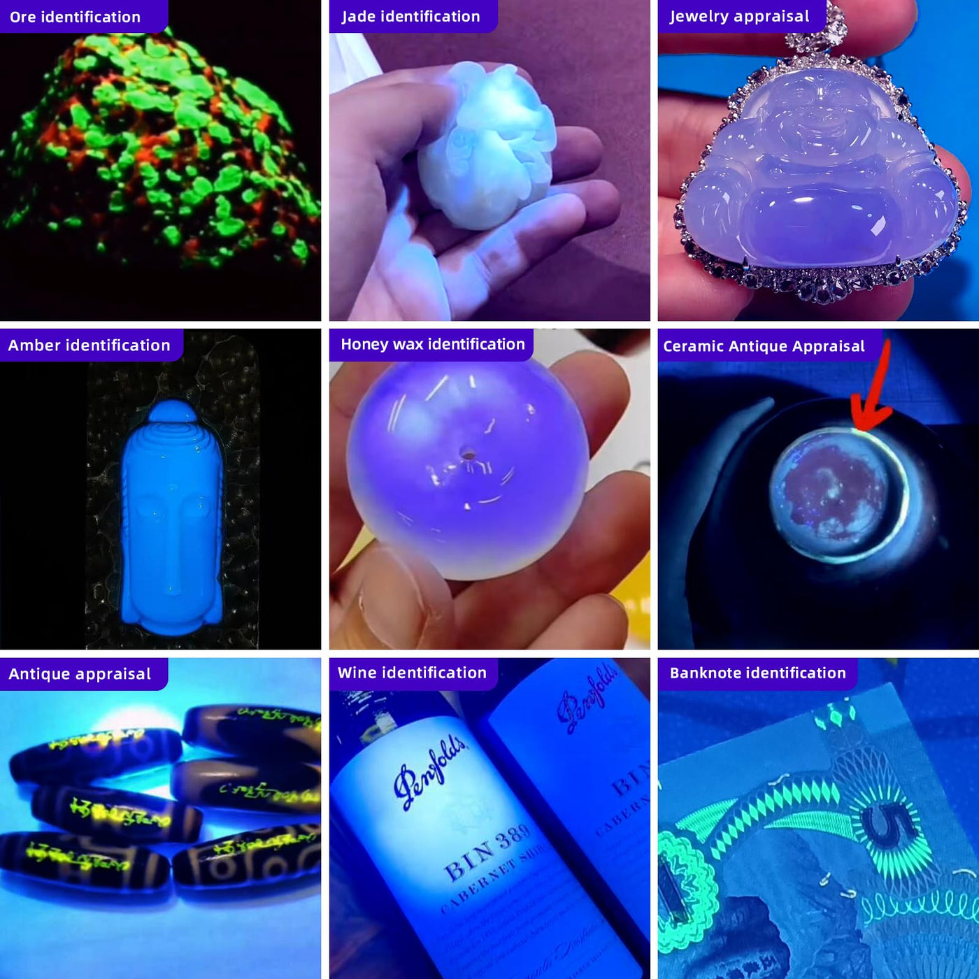 Q: What applications can this UV flashlight be used for?A: The flashlight is versatile and can be used for detecting counterfeit documents, money verification, forensic science, gasoline inspection, and even for hunting scorpions or tracking certain fish.