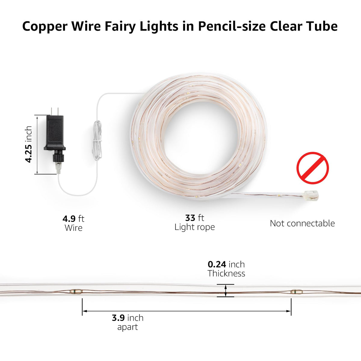 Specifications: Input: 120 V AC Output: 4.5 V DC Rope Light Length: 33 ft Cord Length: 6.6 ft Thickness: 0.24 in Weight: 0.7 lb Color: Warm White 3000K