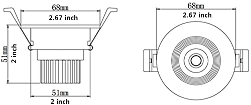 Q: What are the dimensions of the LightingWill LED downlight?A: The downlight has a diameter of 2.67 inches (68mm) and requires a cutout diameter of 2 inches (51mm) for installation.