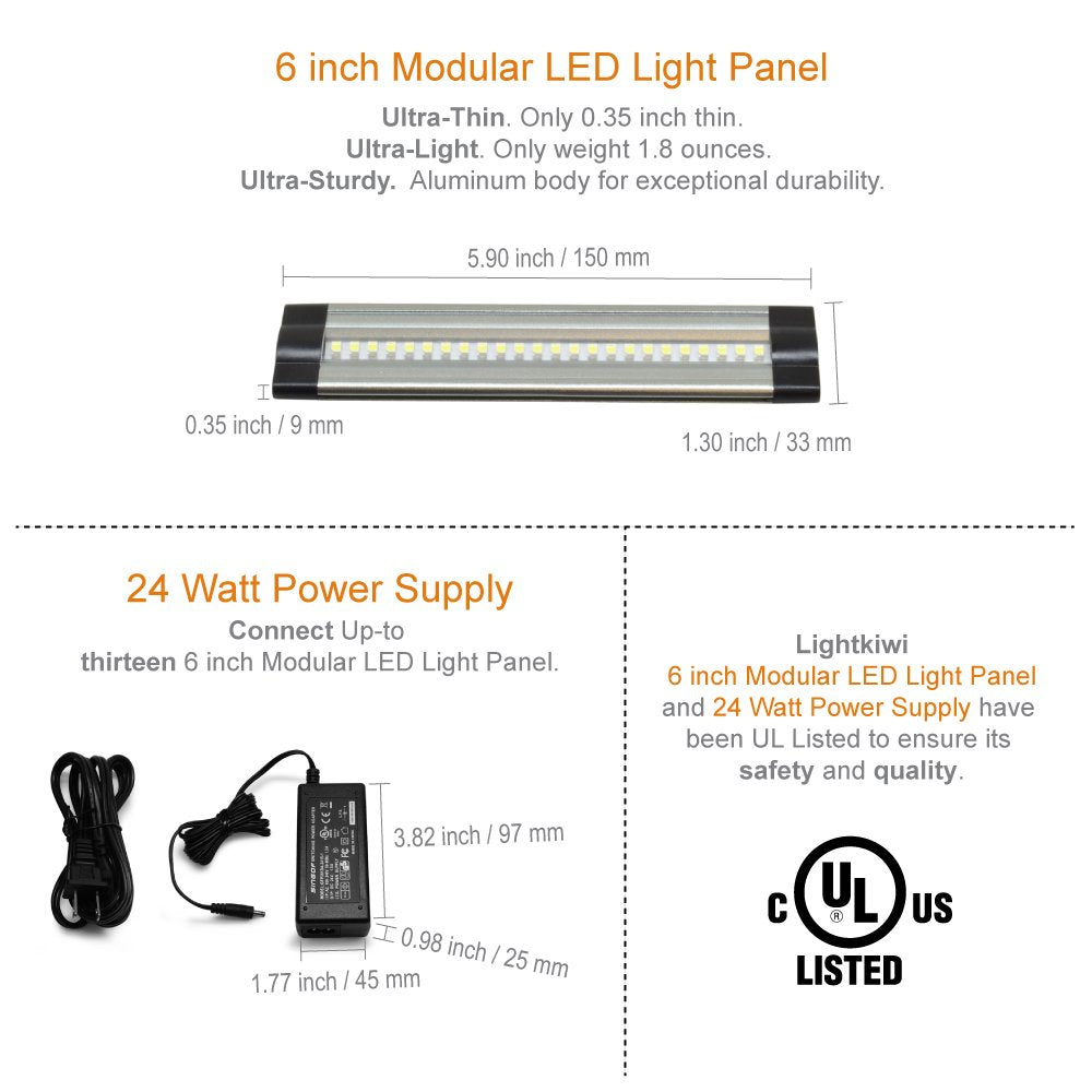 Includes: (12) 6 inch Cool White 6000K Modular LED Under Cabinet Lighting Panel, 24 Watt Power Supply - Link up to (13) 6 inch LED Light Panel, Dimmer Switch, 4-Way Splitter, (12) 3ft Interconnect Cable, (12) Modular Connector, and (24) Mounting Screws. Easy Installation & Operation Lightkiwi Under Cabinet Lighting can be easily installed mostly anywhere with using proper tools and with the dimmer switch, you can easily control the power (on & off) and the dimming. Energy-efficient LED Individual 6 Inch Lightkiwi Under Cabinet Panel has 150 Lumen, bright 24 LED and only uses 1.8 watts maximum.Dimmer Switch with Memory Function Included dimmer switch remembers its previous setting (power and brightness) so it is fully compatible with a wall on/off switch or plug-in timer. Hardwire Installation If you plan to use a wall dimmer switch, you need to do the hardwire installation with dimmable transformer, instead of the included power supply which plugs into a wall outlet, due to the voltage difference between the wall dimmer switch (110V) and LED light panel (24V). If not used with wall dimmer switch, plug-in power supply (except wall mount power supply) can be used to do the hardwire installation, but if a dimmer switch is needed, a 24V dimmer switch is required. You would need to splice the power plug from the power cord and connect to the power source with a junction box or something similar. Wall dimmer switch (110V) is incompatible with plug-in power supply. Power Supply Start Up timeDepends on the wattage of power supply, the start-up time may differ. Please use matched wattage of power supplies for the best result.