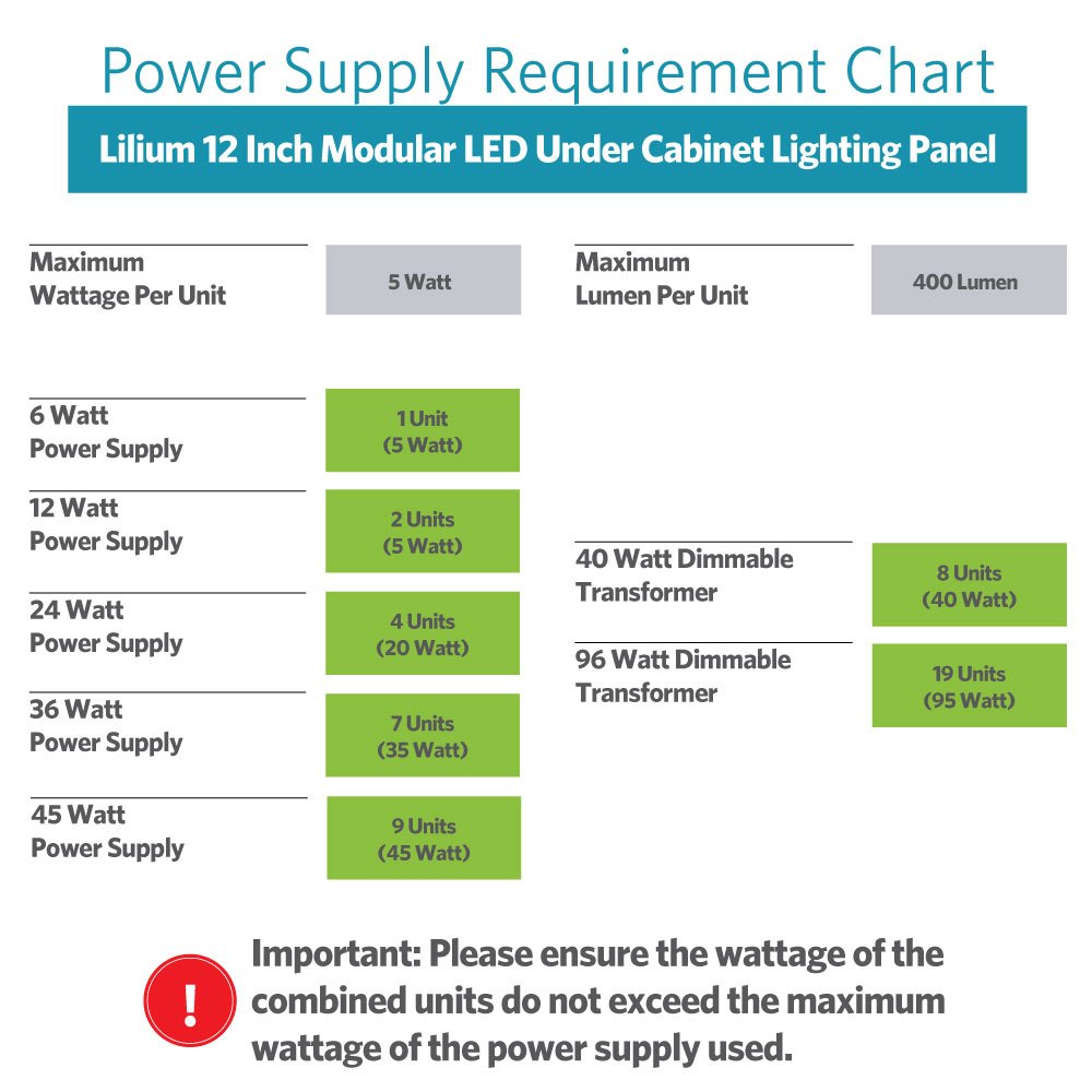 Important: Please ensure the wattage of the combined units do not exceed the maximum wattage of the power supply used. What's Included Lightkiwi Lilium 12 Inch Cool White Modular LED Under Cabinet Lighting Panel 3ft Interconnect Cable Modular Connector (2) Mounting Screw Product Dimension 12.00 x 1.30 x 0.39 inch (305 x 33 x 10 mm)