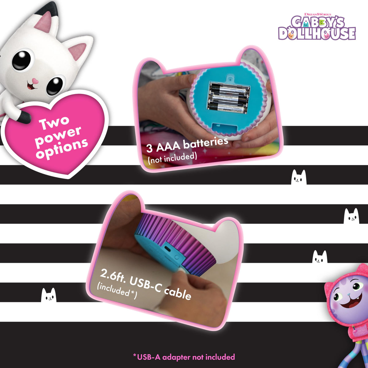 Q: What are the power options for the Gabby’s Dollhouse Cakey Cat Squishy Light?A: The Gabby’s Dollhouse Cakey Cat Squishy Light can be powered using an included 2ft USB-C cable or by three AAA batteries (not included). This allows for versatile usage, whether you want it plugged in at home or need a portable light option.