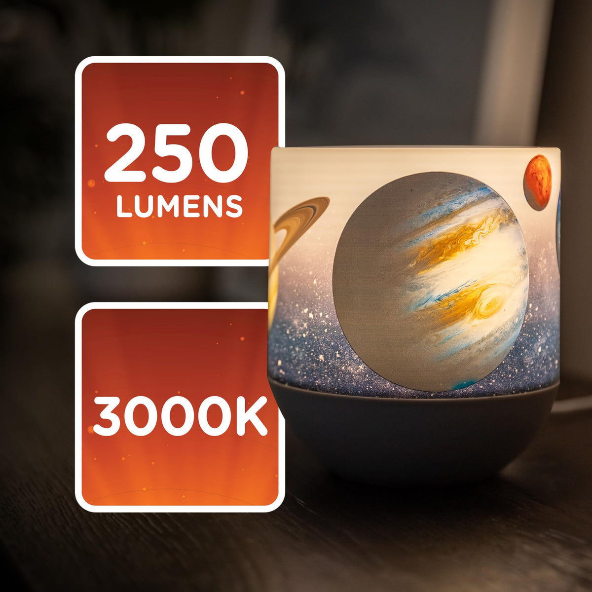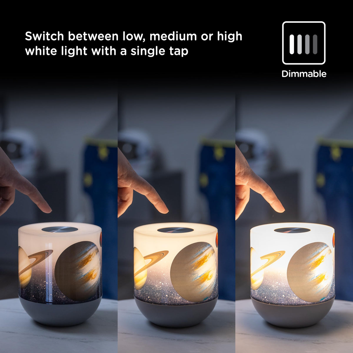 Q: Is the lamp suitable for children's bedrooms?A: Yes, the Lights By Night Space and Planets Table Lamp is ideal for children's bedrooms, as it combines fun color modes with a dimmable white light, creating a calming and engaging atmosphere for kids.