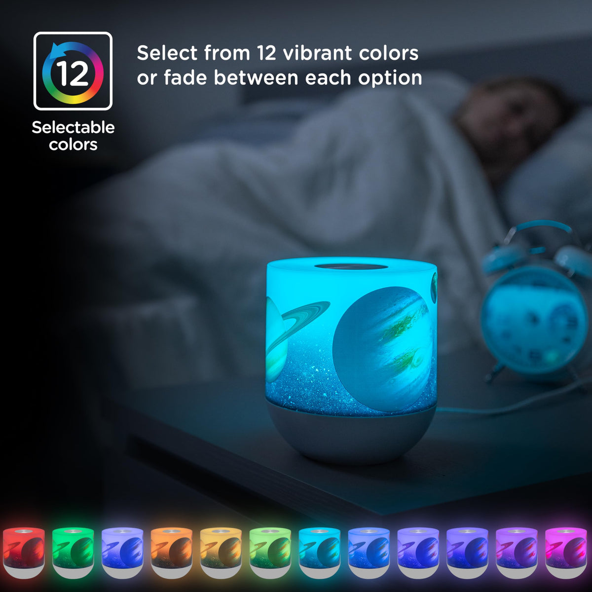 Q: What color options does the Lights By Night Space and Planets Table Lamp offer?A: The lamp features 12 vibrant colors, including red, green, blue, orange, yellow, light green, turquoise, light blue, light purple, light pink, and deep pink, allowing you to customize your space with dynamic color modes.
