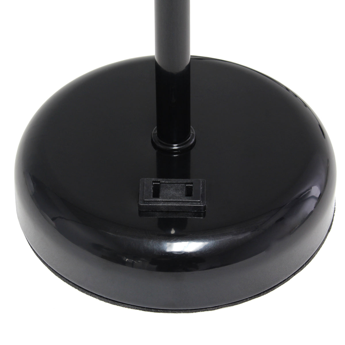 pThis fun and fashionable lamp features a black base and a fabric shade. It comes equipped with a 2 prong outlet seated in the base for use to charge mobile phones, handheld games, tablets, and other small electronics. This lamp will add a fabulous flair to any room. Perfect for bedrooms, kids and teens, college dorms, nurseries, or fun offices!/ppliBulb Type : Incandescent (A-19)/liliSwitch Type : Pull switch/liliSwitch Location : Socket/liliShade Diameter : 8.5/liliShade Top Opening : 8.5/liliShade Bottom Opening : 8.5/liliShade Height/ Slant : 8.5/liliShade Security : Socket Nut/liliNumber of Lights : 1/liliMaximum Wattage : 60/liliShade Material : Fabric/liliCord Length : 5/liliFinish/Color : BLACK BASE/WHITE SHADE/liliPrimary Material : Metal/liliMaterial Breakdown : fabric 25% iron 69%,plastic 6%/liliBase Type : E26 Medium Base/liliBase Dimensions : 14.25 x 5.25 x 5.25/liliHeight from Base to Socket/Shade : 11/liliBulb Included : no/liliETL CERTIFIED/li/p