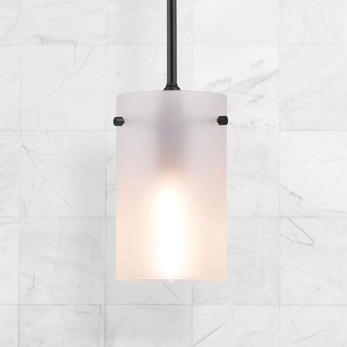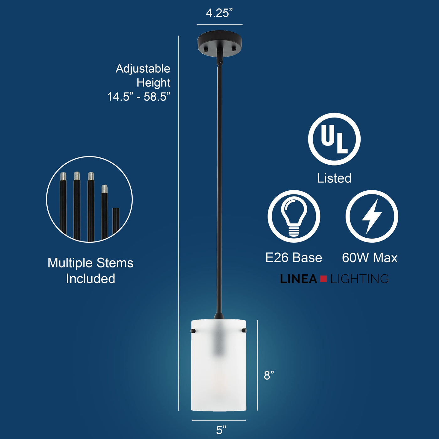 The Effimero Medium Modern Glass Hanging Pendant Light Fixture Makes A Dramatic Design Statement. The Industrial Farmhouse Light Design Features A Frosted Glass Cylinder Shade And Metal Hardware. The Adjustable Height Effimero Hanging Ceiling Light Blends With Many Decor Styles And Is Perfect As Pendant Lighting For Kitchen Island, Over Kitchen Tables And Counters, As A Dining Room Light, Hallway Or Bathroom Pendant Lighting. Metal Construction With A Black Finish Measures 5 Inches Wide By 14.5 Inches High; Frosted Shade Measures 5 Inches In Diameter By 8 Inches High Adjustable - Includes 5 Hard Stems In Assorted Lengths For A Variety Of Hanging Heights; 14.5 Inches Minimum Hanging Height And 58.5 Inches Maximum Hanging Height Dimmable When Used With Dimmable Bulb And Compatible Dimmer Switch Uses One E26-Base Bulb, 60W Max (Not Included) Works With Most Bulbs - Compatible With Smart Bulbs Or Most Medium Base Bulbs Up To 60W 4.25 Inch Round Swivel Canopy Works With Sloped Or Vaulted Ceilings Ul Listed