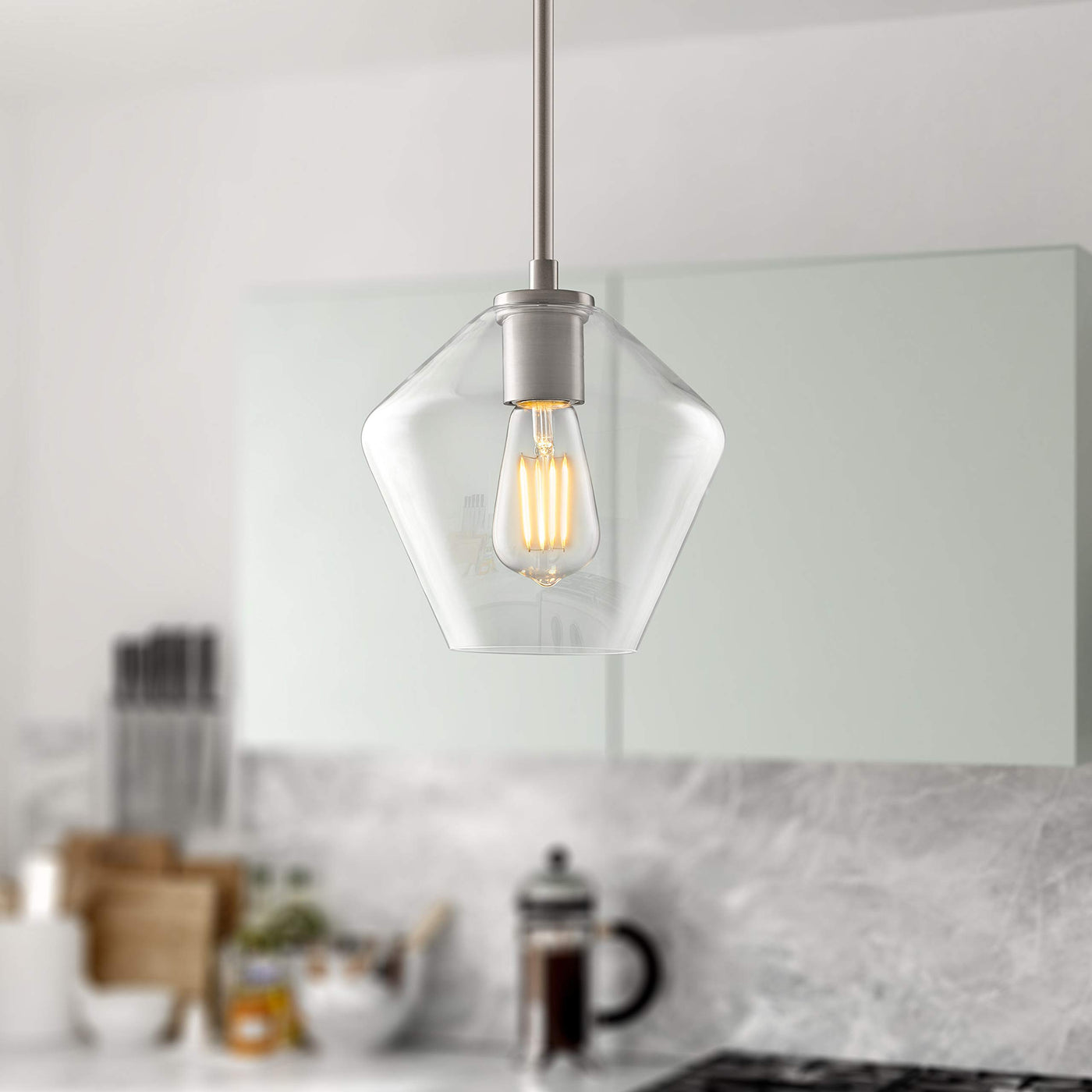 The Macaria Modern Glass Hanging Pendant Light Fixture Makes A Dramatic Design Statement. The Industrial Farmhouse Light Design Features A Clear Glass Shade Which Provides Maximum Illumination. The Adjustable Height Rods Conceal The Wires For A Sleek Streamlined Look. This Hanging Ceiling Light Blends With Many Decor Styles And Is Perfect As Kitchen Island Lighting, Over Kitchen Tables And Counters, As A Dining Room Light Or Hallway Or Bathroom Lighting. Metal Construction With A Brushed Nickel Finish Measures 8 Inches Wide By 11.25 Inches High; Shade Measures 8 Inches Wide By 7.5 Inches High Adjustable - Includes 5 Hard Stems In Assorted Lengths For A Variety Of Hanging Heights; 15.25 Inches Minimum Hanging Height And 59.25 Inches Maximum Hanging Height Dimmable When Used With Dimmable Bulb And Compatible Dimmer Switch Uses One E26-Base Bulb, 60W Max (Not Included) Works With Most Bulbs - Compatible With Smart Bulbs Or Most Medium Base Bulbs Up To 60W 5 Inch Round Swivel Canopy Works With Sloped Or Vaulted Ceilings Hardwired, Does Not Have A Switch. Installation Required, Professional Installation Recommended 1-Year Manufacturer Warranty With Us Based Customer Service Ul Listed
