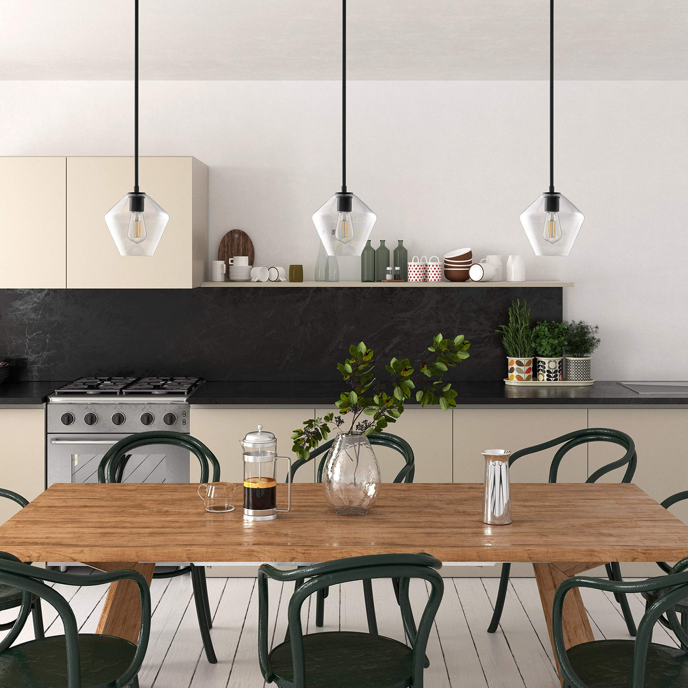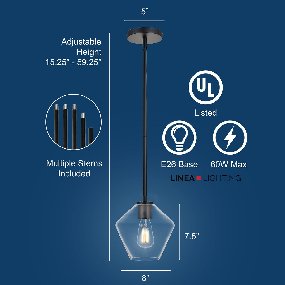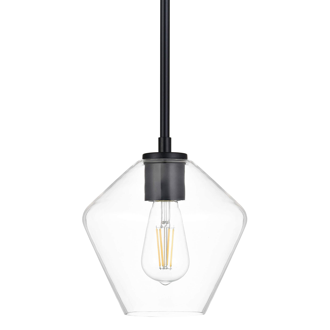 The Macaria Modern Glass Hanging Pendant Light Fixture Makes A Dramatic Design Statement. The Industrial Farmhouse Light Design Features A Clear Glass Shade Which Provides Maximum Illumination. The Adjustable Height Rods Conceal The Wires For A Sleek Streamlined Look. This Hanging Ceiling Light Blends With Many Decor Styles And Is Perfect As Kitchen Island Lighting, Over Kitchen Tables And Counters, As A Dining Room Light Or Hallway Or Bathroom Lighting. Metal Construction With A Black Finish Measures 8 Inches Wide By 11.25 Inches High; Shade Measures 8 Inches Wide By 7.5 Inches High Adjustable - Includes 5 Hard Stems In Assorted Lengths For A Variety Of Hanging Heights; 15.25 Inches Minimum Hanging Height And 59.25 Inches Maximum Hanging Height Dimmable When Used With Dimmable Bulb And Compatible Dimmer Switch Uses One E26-Base Bulb, 60W Max (Not Included) Works With Most Bulbs - Compatible With Smart Bulbs Or Most Medium Base Bulbs Up To 60W 5 Inch Round Swivel Canopy Works With Sloped Or Vaulted Ceilings Hardwired, Does Not Have A Switch. Installation Required, Professional Installation Recommended 1-Year Manufacturer Warranty With Us Based Customer Service Ul Listed