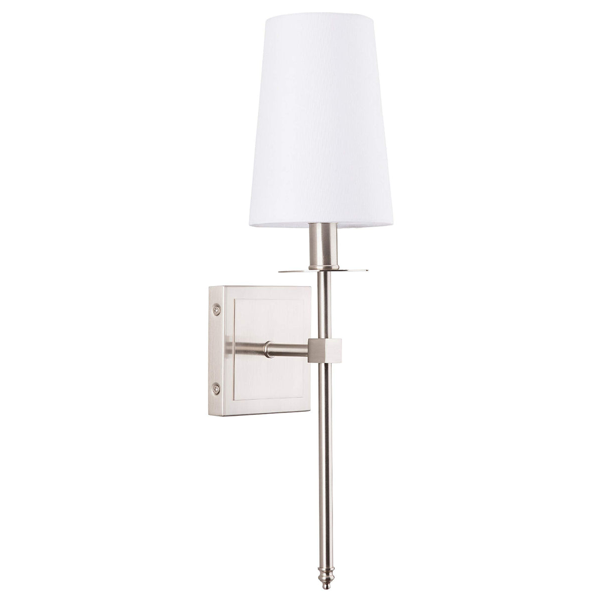 The Torcia wall sconce, made by Linea di Liara, brings a touch of contemporary sophistication perfect for bathrooms, bedrooms, corridors, entryways and living areas. This brushed nickel light fixture has a white fabric shade that measures 7'' high x 5'' in diameter. The wall light itself is 20'' high x 5'' wide and extends 6'' from the wall. The backplate is a 4.5'' square and is compatible with most 4'' octagonal, round and square or 2'' x 4'' junction boxes. It features an E26 socket that is compatible with a variety of incandescent, LED, CFL and halogen bulbs (60W max, sold separately) and is fully dimmable when used with a dimmable bulb and compatible dimmer switch. *Must be hardwired, there is not a switch or plug on the fixture itself.