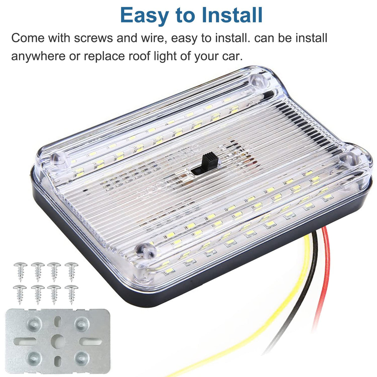 Installation (WIRING INSTRUCTION): 1. The working voltage of this light is 12 volt DC. Cut off the power 2. Get the original wire through the center hole of the base plate, and make it fixed with screws. 3. Wire the light. (red wire for anode, black wire for cathode, yellow wire for door lamp) 4. Fill the rest down-lead in the ceiling. Insert the main body. Glide and inlay to make it fixed.