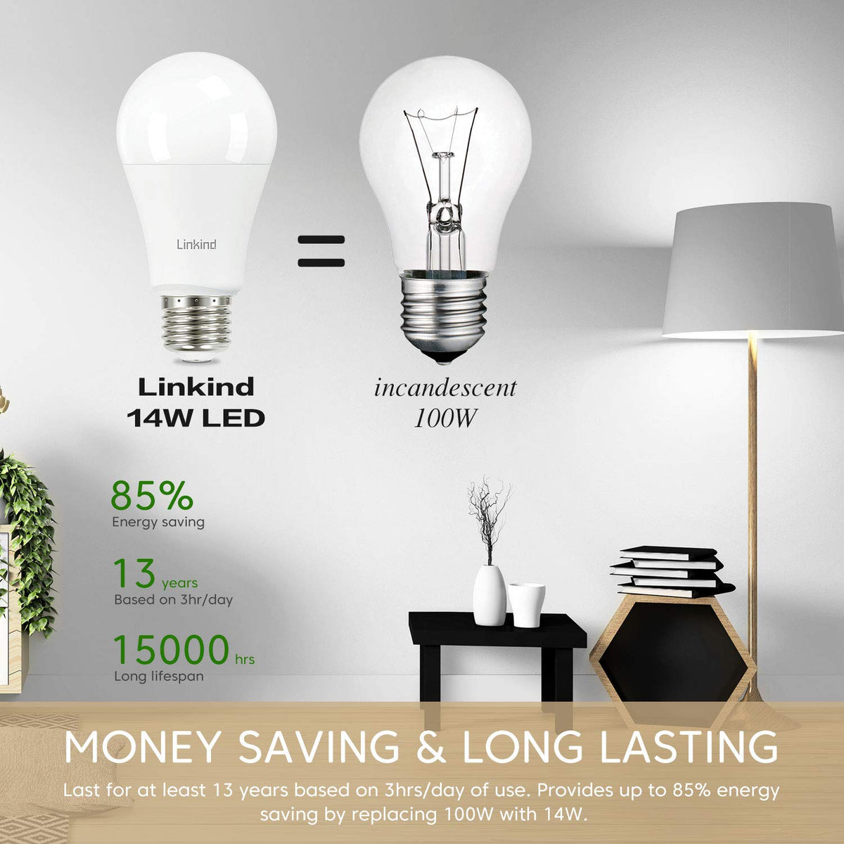 Linkind A19 Led Light Bulb, 100W Equivalent Light Bulbs, 14W 5000K Daylight, 1600 Lumens Non-Dimmable Led Bulb, E26 Standard Bas