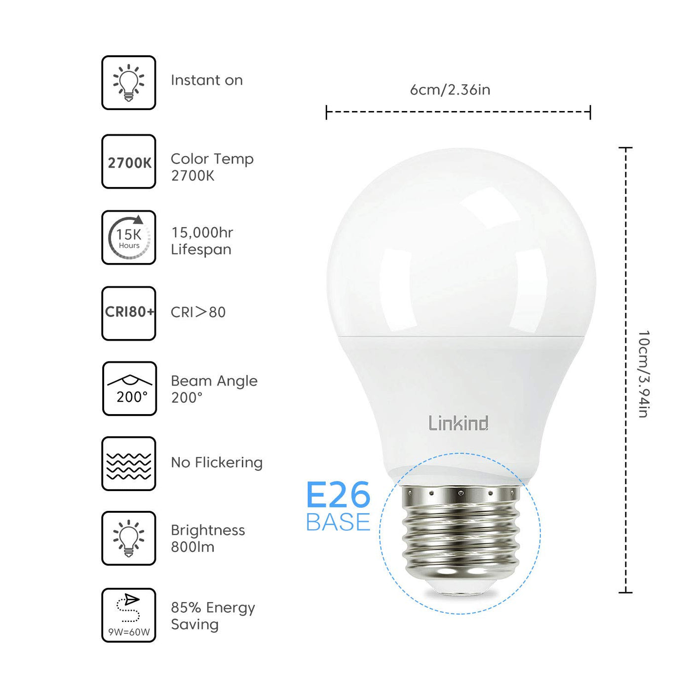 Linkind A19 Led Light Bulb, 60W Equivalent Light Bulbs, 9W 2700K Soft White, 800 Lumens Non-Dimmable Led Bulb, E26 Standard Base
