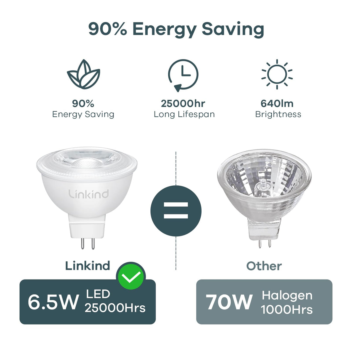 Q: What is the wattage and brightness of the Linkind MR16 LED bulb?A: The Linkind MR16 LED bulb has a power consumption of 6.5W, which is equivalent to a traditional 70W halogen bulb, providing a brightness of 640 lumens.