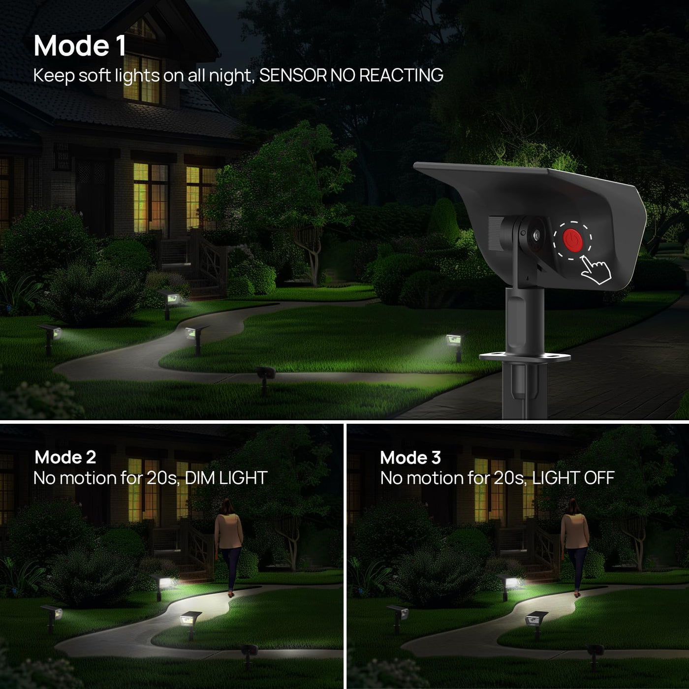 Q: What are the different lighting modes available for the Linkind Solar Lights?A: The Linkind Solar Lights feature three distinct lighting modes: 1. Dim Light Mode, where the light remains dimly lit at all times; 2. Dim Light Sensor Mode, which is low brightness without motion and switches to high brightness when motion is detected; and 3. Sensor Mode, where the light is off without motion and activates to high brightness upon detecting movement.