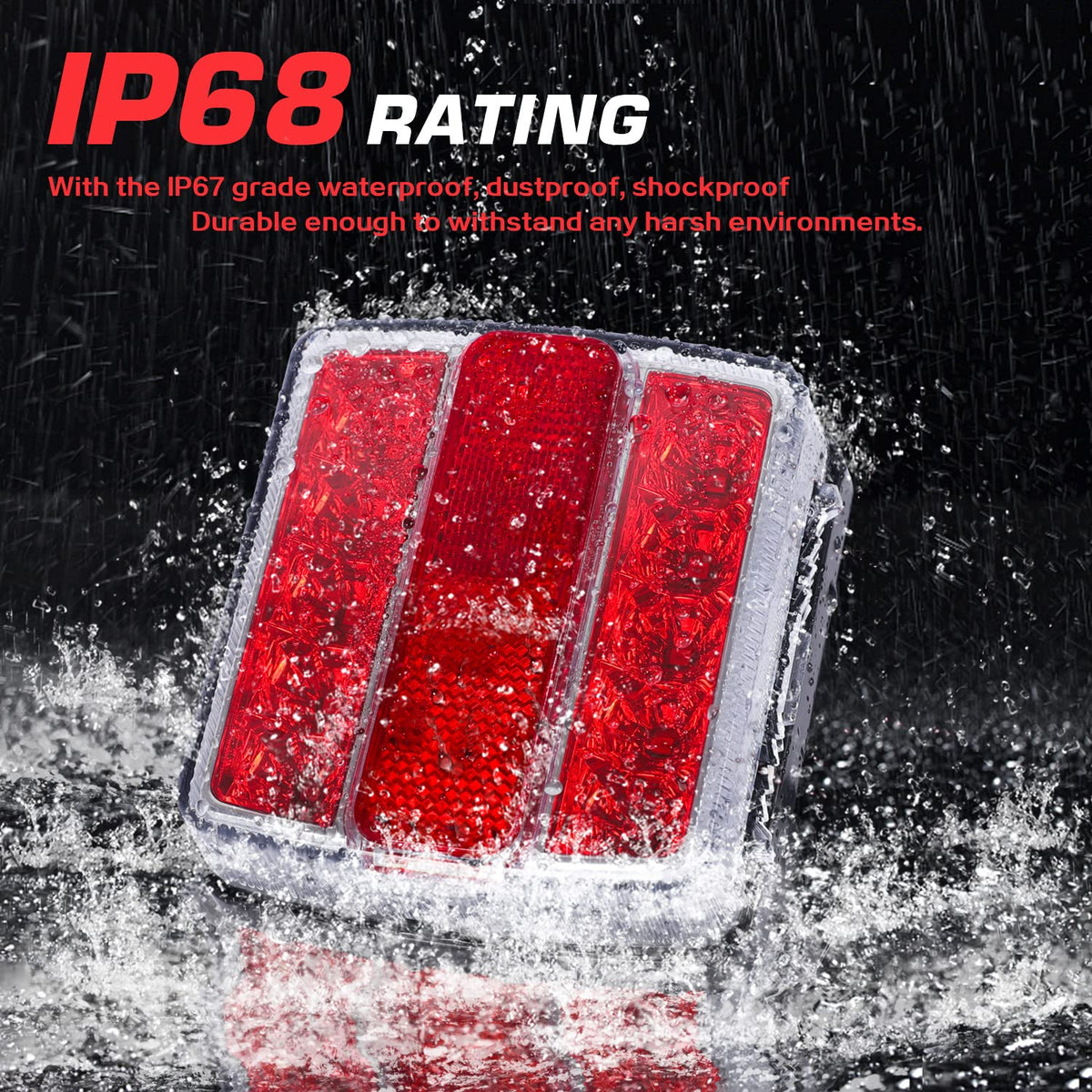 - IP68 waterproof rating: Fully sealed and rated for IP68 waterproof level, these lights are perfect for use on trailers that may be submerged, such as boat trailers, ensuring durability and reliability.