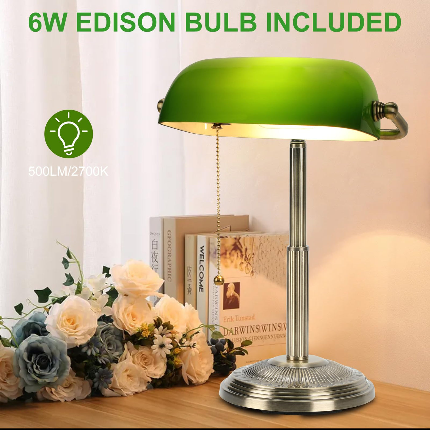 Elevate your workspace with the LINNMON Bankers Desk Lamp, a vintage-inspired piece that combines retro charm and modern functionality. This green desk lamp features a classic design with a pull-chain switch, allowing you to easily control the light. Crafted with meticulous attention to detail, this lamp adds a touch of nostalgia to your home office or study area. The included LED bulb provides ample illumination while saving energy, ensuring a warm and inviting ambiance. With its timeless appeal and practical features, the LINNMON Bankers Desk Lamp is a stylish and versatile addition to any decor. Dimensions: 15.5 inches tall, 6.9 inches wide.