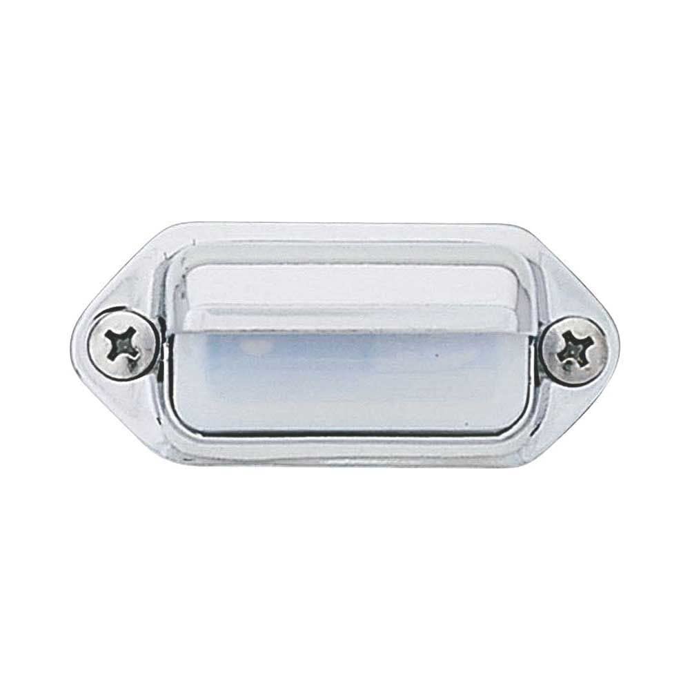 Mounts with two stainless steel screws on 2 in centers and has separate ground wire for non-metallic surfaces. Polished, chrome-plated brass housing with hooded shield to prevent upward glare. 2-9/16 in W x 1-3/16 in H x 1 in D.