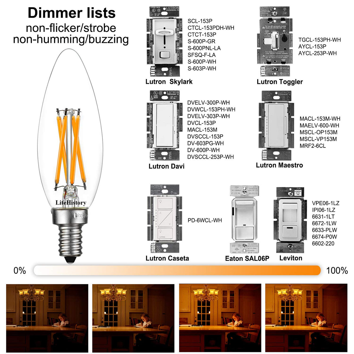 - Q: How does the dimmable feature work on this LED bulb? A: This E12 LED bulb offers smooth dimming from 0% to 100%, allowing you to adjust the brightness according to your preference or mood. It has been tested for compatibility with 95% of Lutron, Leviton, and Eaton dimmers, ensuring a flicker-free experience.