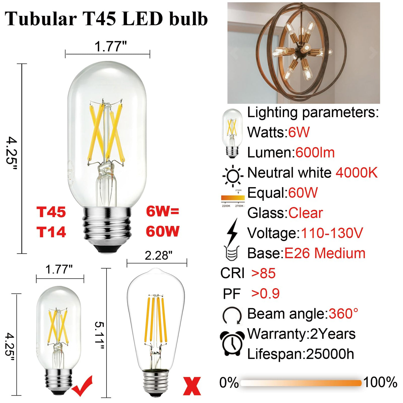 Litehistory E26 Edison Bulb 6W Equivalent E26 Led Bulb 60 Watt Dimmable Neutral White 4000K E26 Light Bulb Ac120V 600Lm Tubular T14 T45 Led Bulb For Pendant,Sputnik,Vanity,Chandeliers Pack Of 6