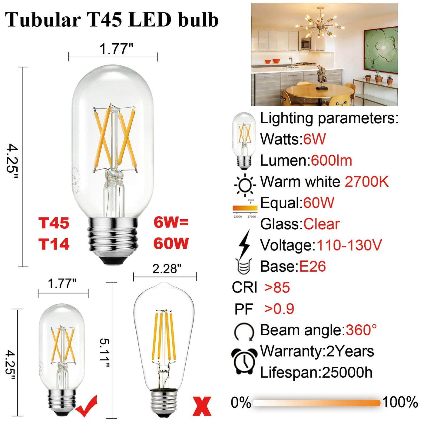 Litehistory E26 Led Bulb 6W Equivalent E26 Led Bulb 60 Watt Dimmable Warm White 2700K E26 Edison Bulb Ac120V 600Lm Tubular T14 T45 Led Bulb For Pendant, Sputnik,Vanity,Chandeliers Pack Of 6