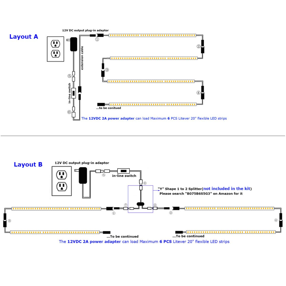 Litever 4-Strip Under Cabinet Lighting Kit Including The Following Parts: (1) One Unit Of Class 2 Certified Power Adapter: Input: 100-240Vac; 50/60Hz; Standard 2-Pin Us Plug Output: 12Vdc, Maximum 2.0A, 24W Output Cables: 5 Feet 22 Awg Cable With Male Dc Jack Of 5.5Mm X 2.1Mm This Power Adpater Can Support Maximum 6 Pcs Litever 20 Inches Flexible Led Strips. (2) One Unit Of On/Off Swith Input: Female Dc Jack Of 5.5Mm X 2.1Mm With Cable Of 4 Inches Output: Male Dc Jack Of 5.5Mmx2.1Mm With Cable Of 4 Inches (3) Two Units Connector Adapter It Connects The Male Dc Jack Of The On/Off Switch And The Litever 20 Inches Flexible Led Strips. (4) Four Units Of 20 Inches Flexible Led Strips 4W Per 20 Inches.300 Lumen Per 20 Inches. Warm White 2700K. Cri >80. Mounting By Self-Adhesive Tape Or By Supplied Mounting Cips. (5) Three Units 12 Inches Extension Cables (6) Two Units 20 Inches Extension Cables (7) 20 Pcs Mounting Clips And Screws (8) 1 Printed User Manual Installation Tips For You To Get Wonderful Result: 1.When Mounting The Flexible Led Strips By The Supplied Self-Adhesive Tapes, Pls Clean, Dry And Even The Surface Where The Self-Adhesive Pads Will Be Applied. Press The Led Strip Hard To Make The Self-Adhesive Tapes Stick The Surface Firmly. This Is Very Important For Firm Mounting. 2.If You Want The Led Strips Go Into 2 Different Directions, You Can Use A ?Shape Power Splitter. Pls Search ?075B6S5G3On Amazon.Com 3.If You Are Planning To Use This Lighting Kit Inside A Wardrobe Or Closet, You Can Add A ?Abinet-Door-Switchinto The System. With Correct Installation, The Lights Will Come Automatically When You Open The Door Of The Wardrobe Or Closet. For That, You Can Search ?01Lcm4Aeqon Amazon.Com