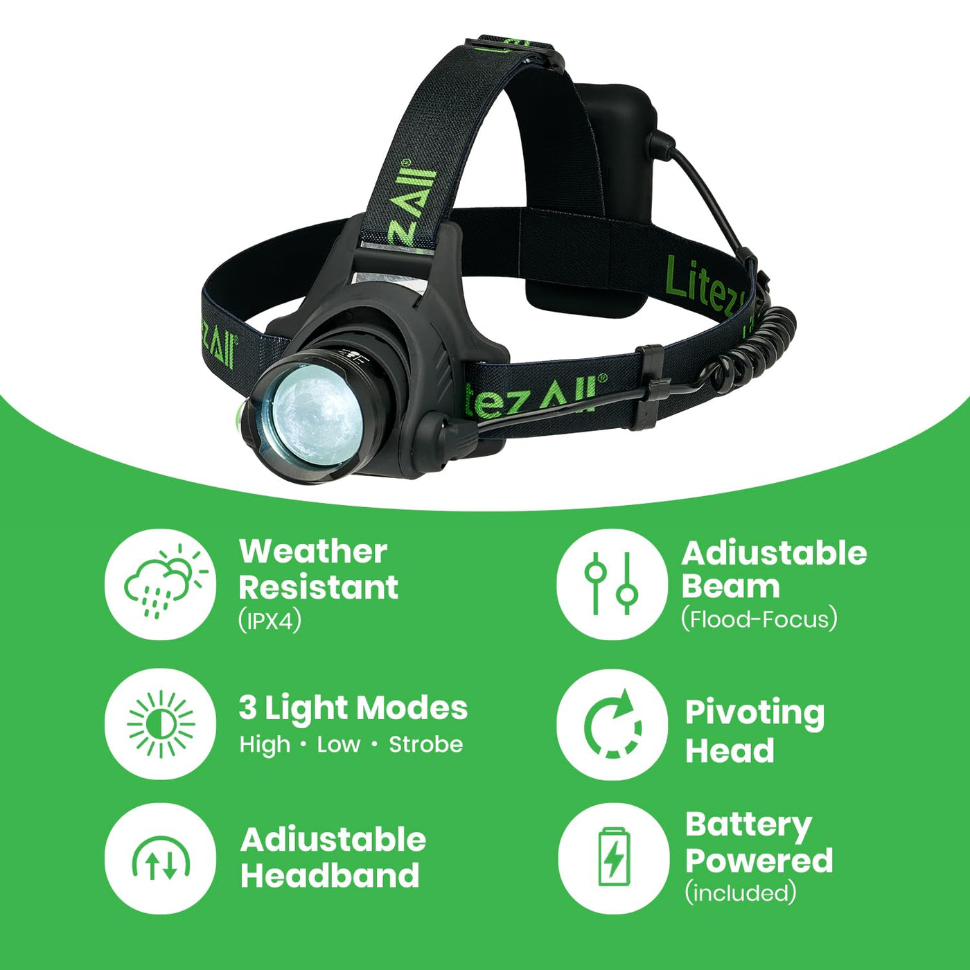 LitezAll LED Headlamp Work Light, 800 Lumen Adjustable Battery Powered Head lamp with 3 Modes, Weather Resistant Head Lamps Flas