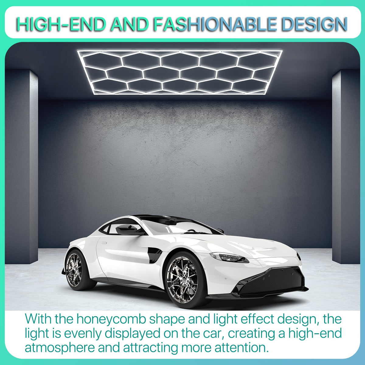 Litezone Hexagonal Garage Lights -- A Set Of Honeycomb Lights That Combine Appearance And Practicality, Hexagon Lighting Can Not Only Meet The Lighting Needs Of Car Beauty Shops And Car Care Shops, But Also Highlight The High-End And Professionalism Of The Store And Attract Customers' Attention. 1.High Efficiency And Energy Saving The 640W Hexagon Led Lights For Garage Light Effect Is As High As 120Lm/W, Which Can Provide More Light Under The Same Power And Save You More Than 90% Of Electricity Bills. 2.Safe And Reliable The Led Hexagon Garage Light Uses Pc Lampshade And Aluminum Lamp Body, Which Has Fast Heat Dissipation, Good Flame Retardant Performance And Good Electrical Conductivity. Hexagon Lights Garage Use Plug-In Sealed Shell To Prevent Leakage And Make It Safer. 3.Super Bright Garage Hexagon Lights Built-In High-Quality Led Chip Can Provide 6500K Stable White Light, And Hex Lights Garage Uses The High Light Transmittance Lampshade Makes The Entire Area As Bright As Day. 4.Easy To Install Made Of Ultra-Light Material, The Hexagon Ceiling Light Can Be Installed By One Person. Hex Garage Lights Have Two Installation Methods, You Can Use Screws To Fix The Garage Light To The Ceiling Or Wall, Or You Can Use Nylon Ties To Fix It On A Hanging Shelf. 5.Widely Used Honeycomb Lights Ceiling Can Be Used In Garages, Studios, Gyms, Offices, Bars, Hair Salons, Shops, Games, Workshops, Living Rooms, Warehouses, Basements, Car Washes, Repair Shops, Showrooms And Other Places That Require Lighting And Decoration. 6.Industrial And Commercial Grade Can Be Used For Car Detailing Ceiling Shop Lights For Garage, Shop Detailing Lights, Detailing Lights For Garage, Hexagonal Grids For Garage, Ceiling Hexagon Lights, Hex Shape Garage Lights, Led Car Detailing Light, Car Beauty Detail Lights. Specification: Power: 7W Per Light Tube, 18W Per Long Frame Tube Input Voltage: Ac120V Light Efficiency: 120Lm/W Cri:≫=80 Color Temperature: 6500K Color: White